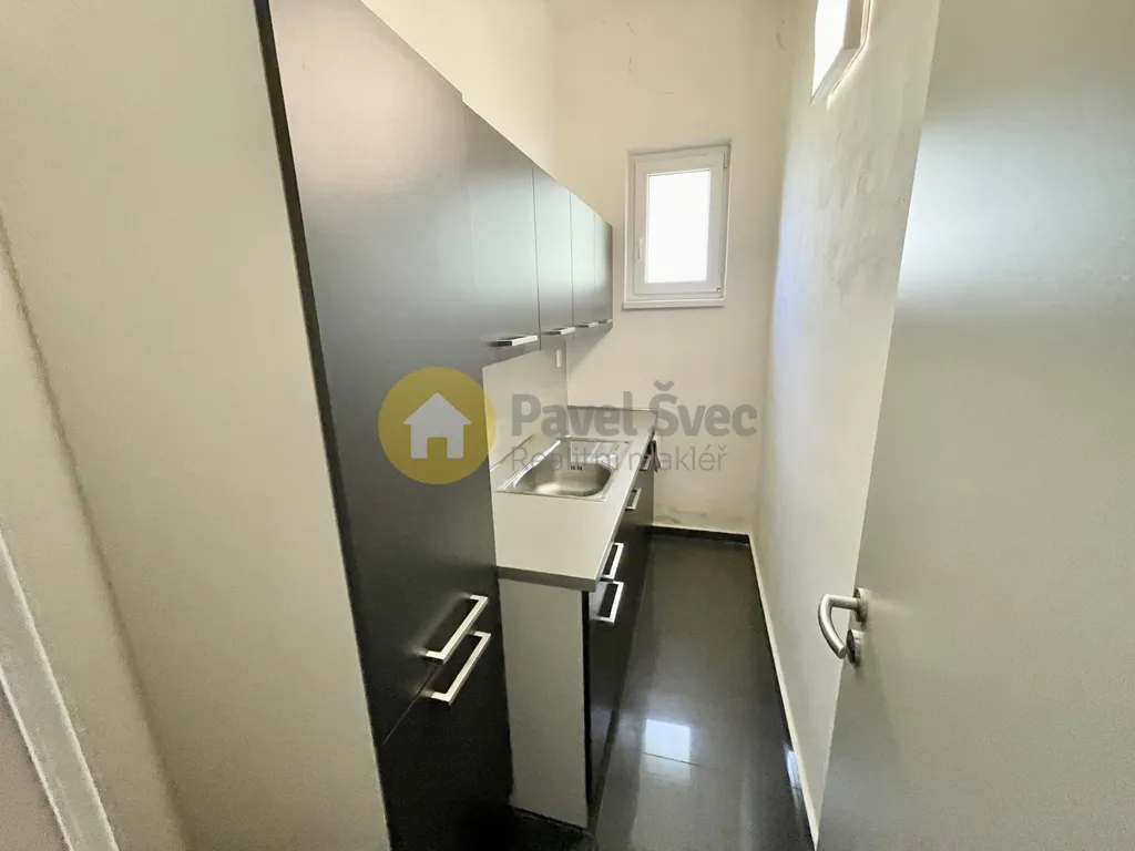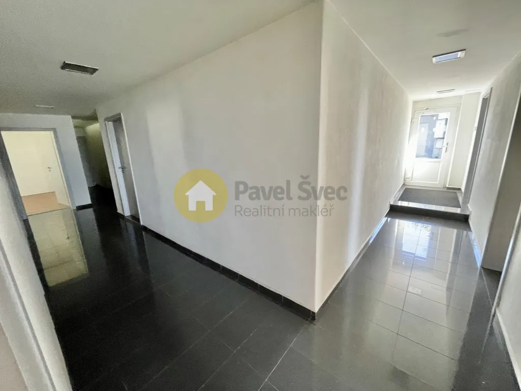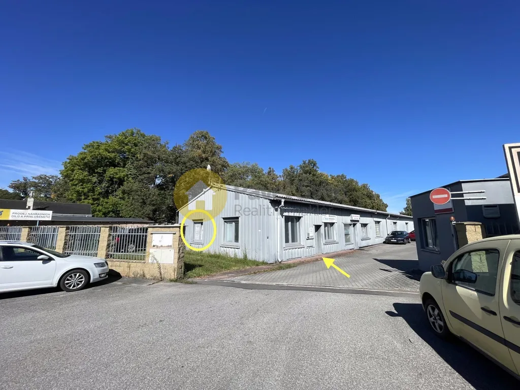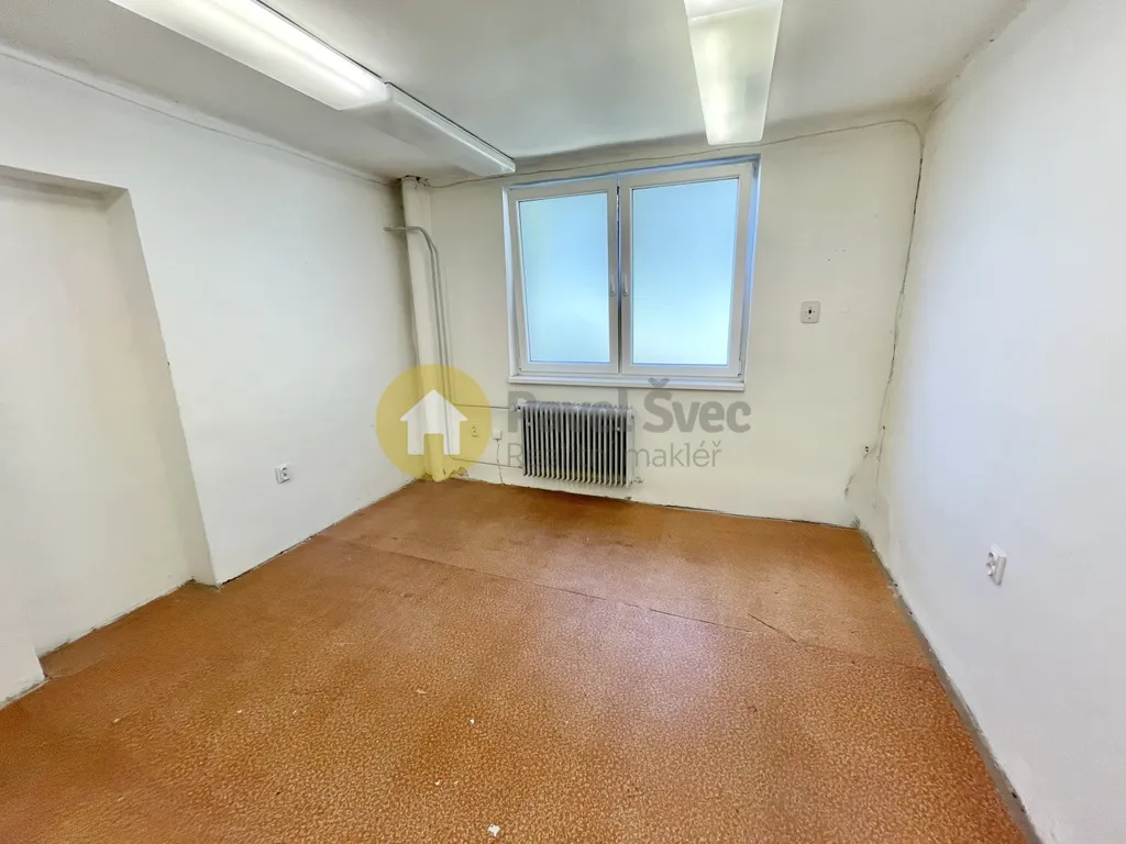 Kancelář s oknem a kobercem na podlaze (dojde k výměně a revitalizaci prostoru), přes chodbu sklad - místnost s oknem, topením a osvětlením.