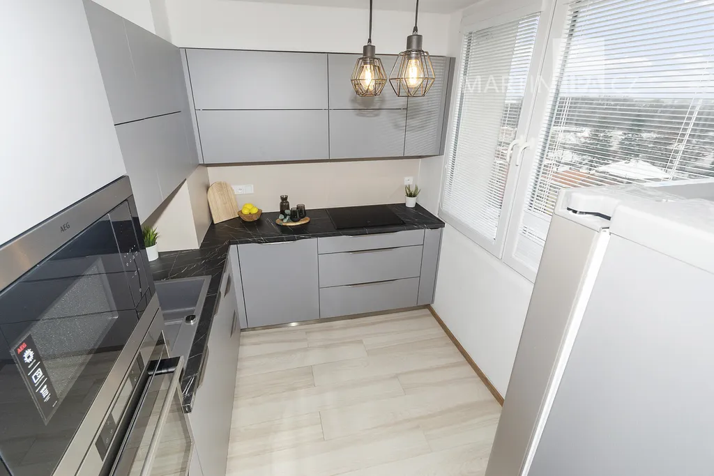 Přesuňme se rovnou do kuchyně. Ne malá, ne obří – tak akorát. Čisté linie, úložné prostory, vestavné spotřebiče AEG, indukce, mikrovlnka, trouba, a k tomu americká lednice s výrobníkem ledu. Velké okno poskytne světlo pro všechna vaše kulinářská kouzla – a když kouzlo selže, snadno vyvětráte.