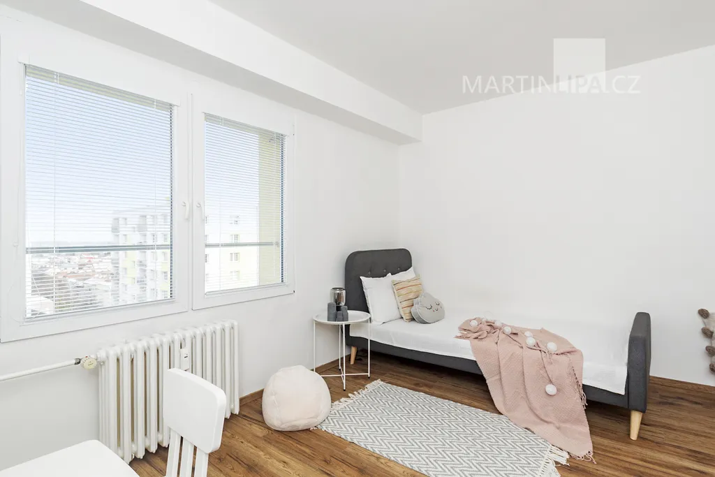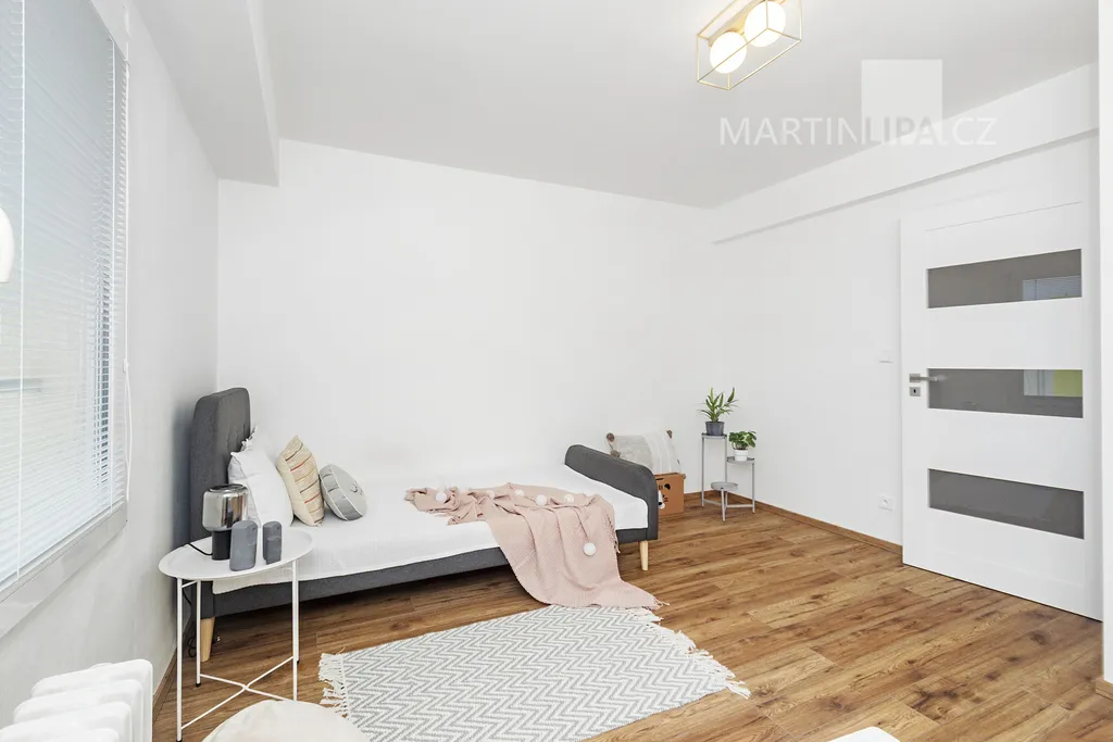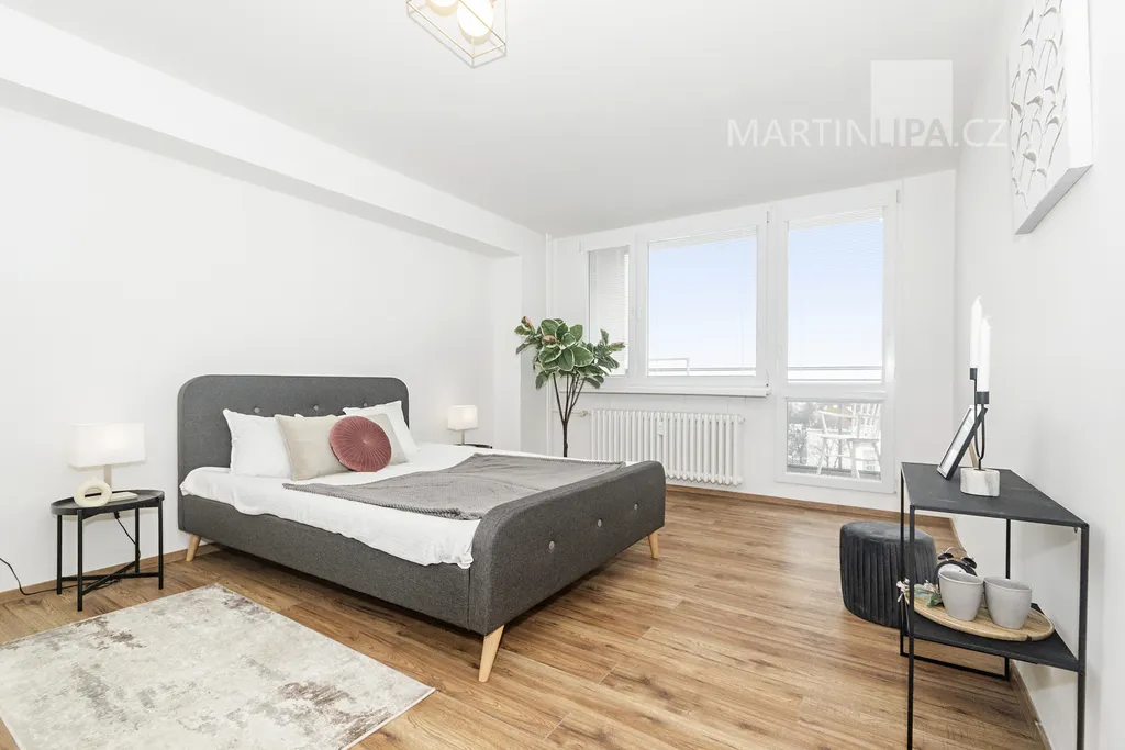 A teď do ložnice, kde rána začínají a večery končí. Na více než 22 metrech se sem vejde velká postel, skříň i pracovní stůl a pořád tu zůstane místo, aby místnost dýchala. Velká okna, vstup na lodžii. Místo, kde si člověk neukopne palec o postel a klidně si zacvičí jógu.