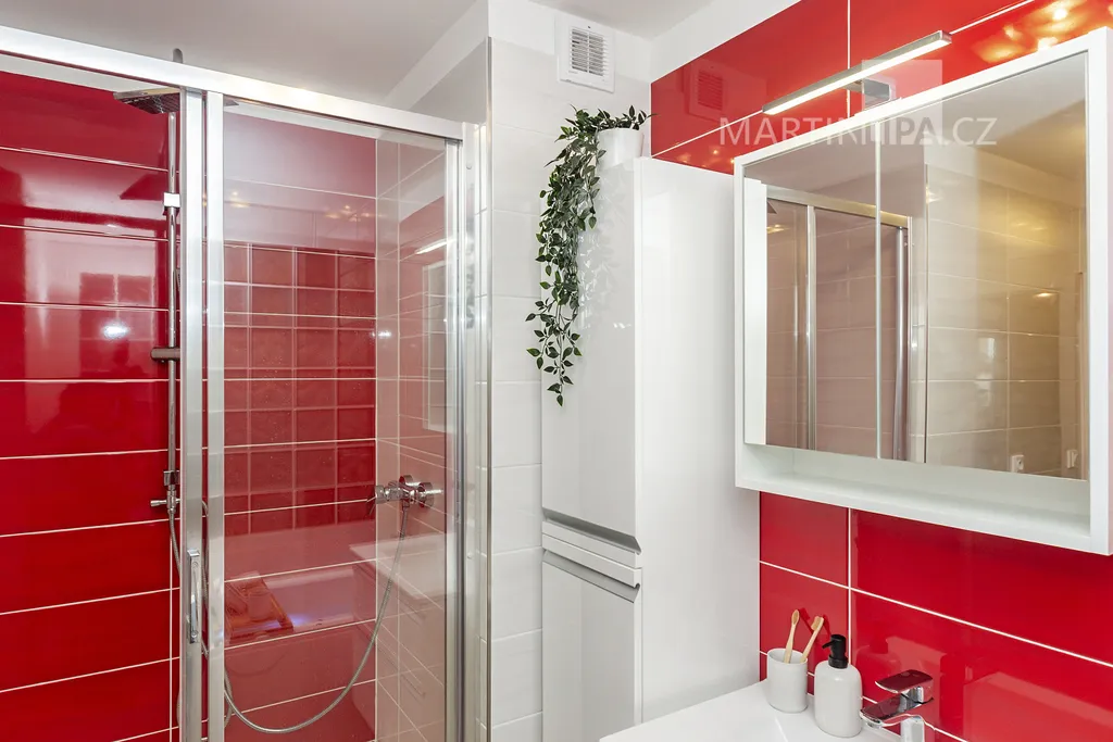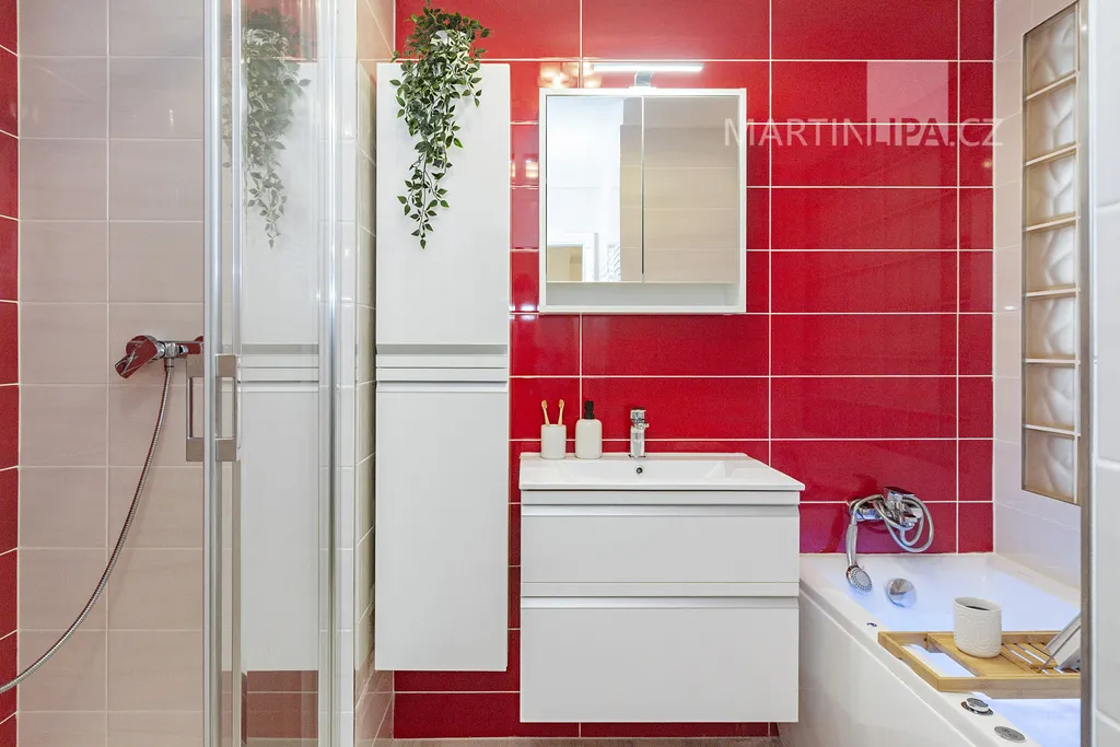 Domácí wellness, nebo, chcete-li, koupelna. Dominantní červenobílé obklady, skleněná stěna z luxfer, skříňka s umyvadlem a hlavně masážní vana s podsvícenou vodou. Stačí napustit, zapálit svíčku a máte večerní spa. Pokud není čas na dlouhý relax, je tu velký sprchový kout a žebříkový radiátor.