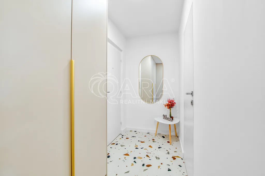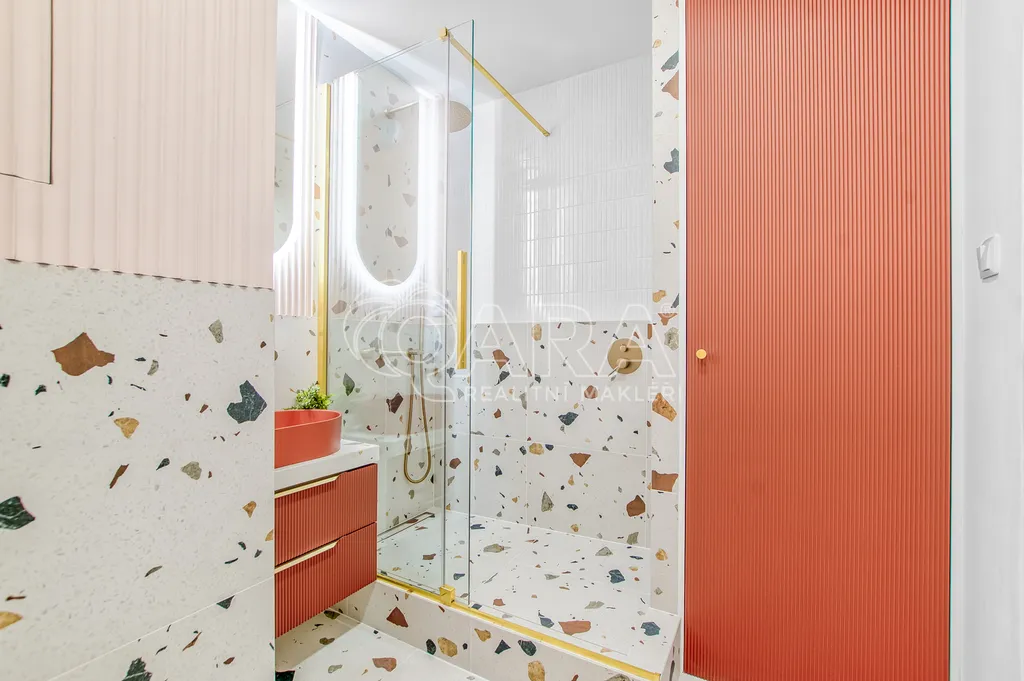 Koupelna je řešena moderně a prakticky. Je přístupná bezfalcovými dveřmi se skrytými zárubněmi a je zde sprchový kout s bílým malometrážním obkladem. Stěny jsou obloženy keramickým obkladem v dekoru Terrazzo s kamenickými rohy. Za zrcadlem s integrovaným LED osvětlením je dekorativní panel v jemném lososovém odstínu. Osazeny jsou podomítkové baterie v matně zlatém chromu a nechybí prostor pro pračku a sušičku skrytý za kvalitními dvířky.