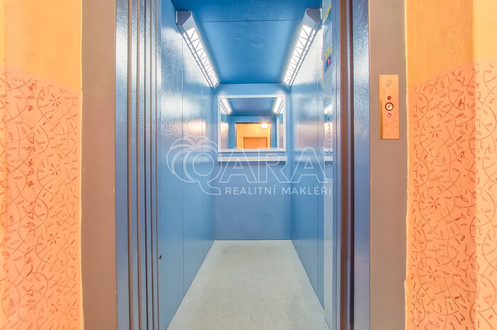 Byt má výměru 40 m2. Do pátého patra vede prostorný výtah a následně se pokračuje krátkým schodištěm do šestého podlaží kde se byt nachází.