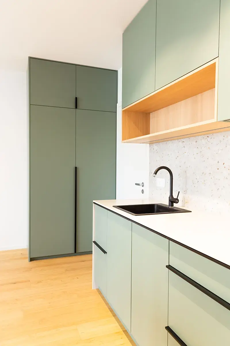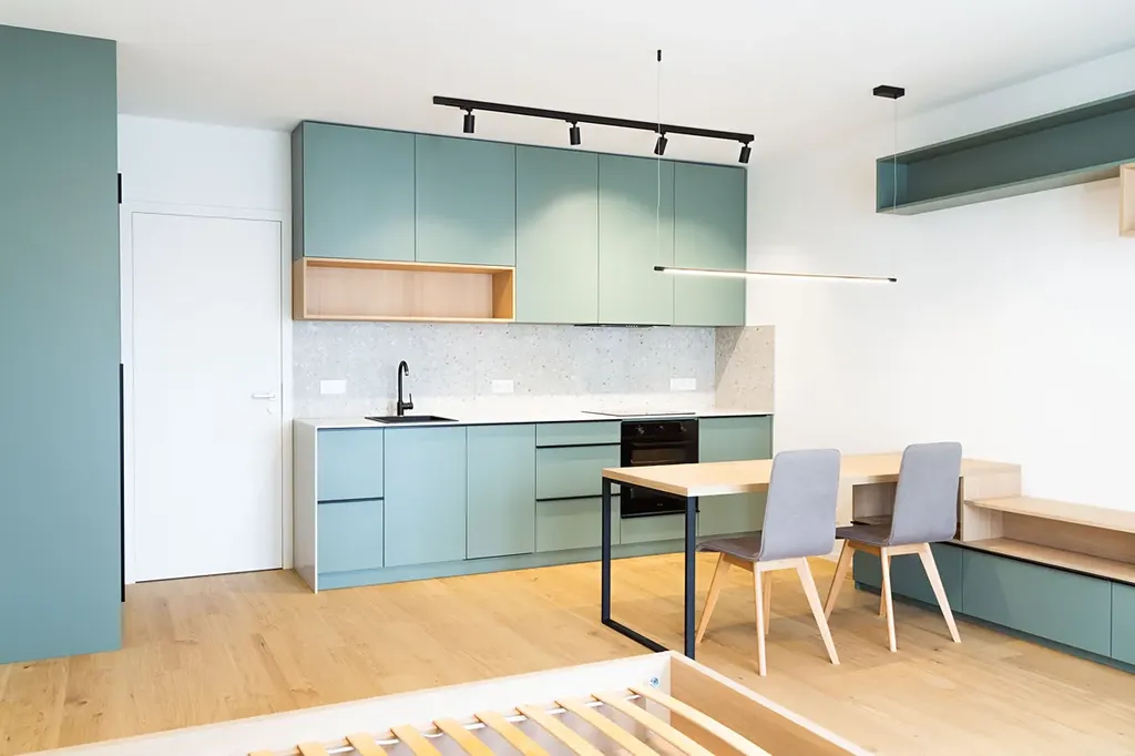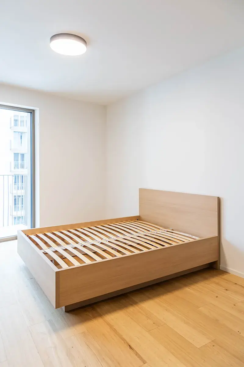 Vybavení bytu: předsíň s praktickými úložnými prostory, kuchyňská linka na míru se spotřebiči (lednice s mrazákem, trouba, varná deska, digestoř, myčka), pračka, postel bez matrace a obývací stěna na míru. Byt bude také dovybaven venkovními black-out žaluziemi.