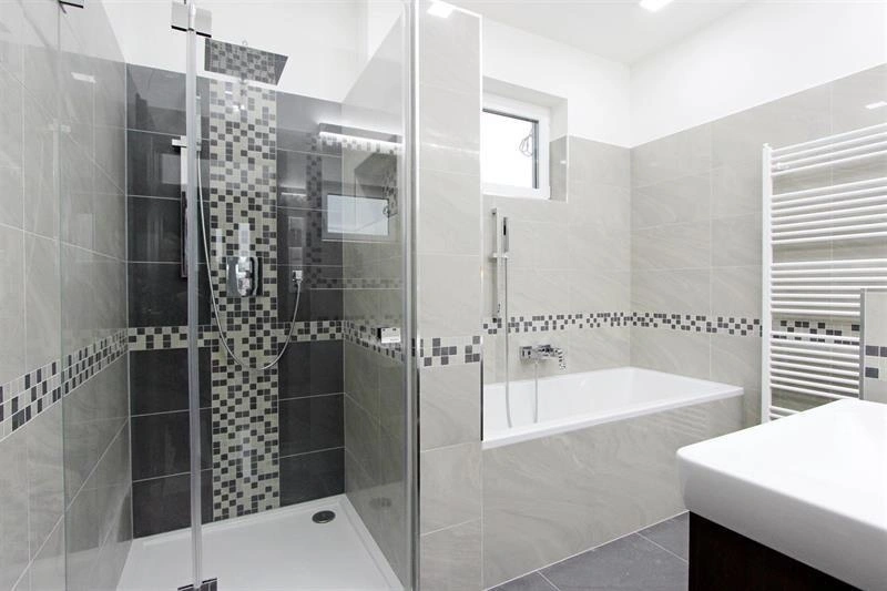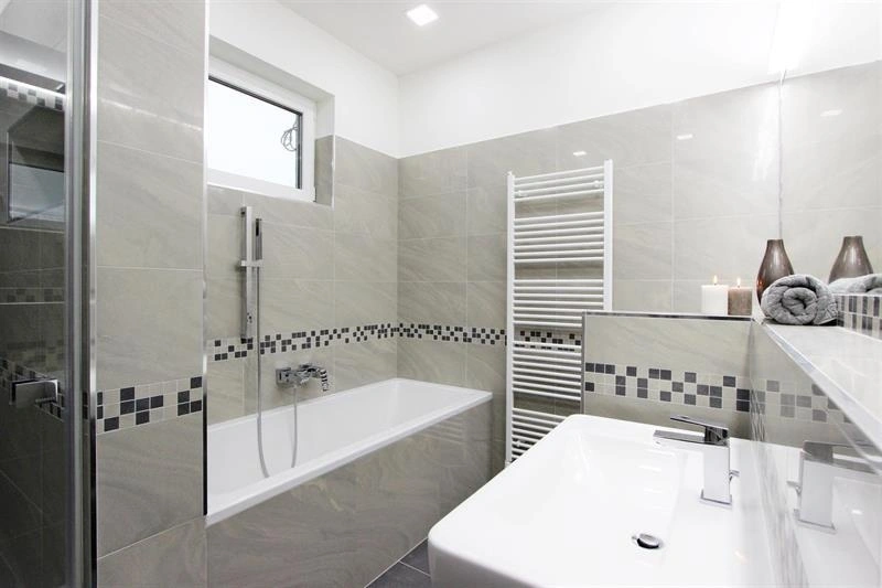 V celém bytě je dlažba s dekorem mramoru, topení podlahové.