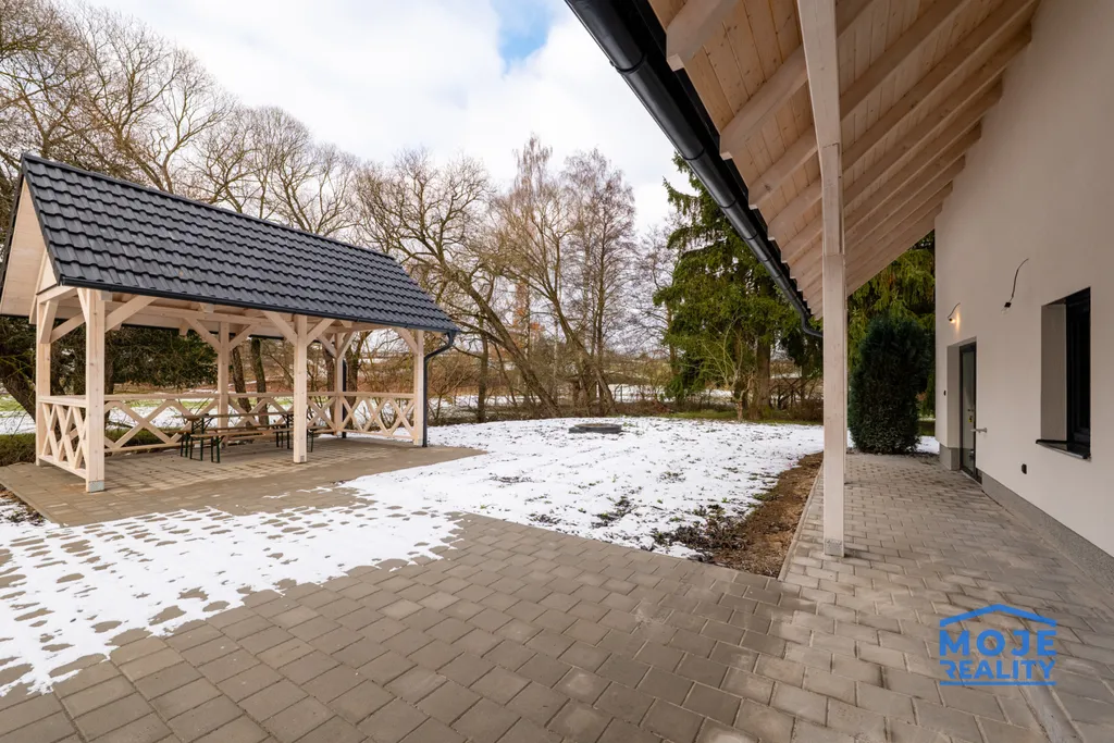 Venkovní altán v jednotném stylu domu – stejný krov i stejné střešní tašky.