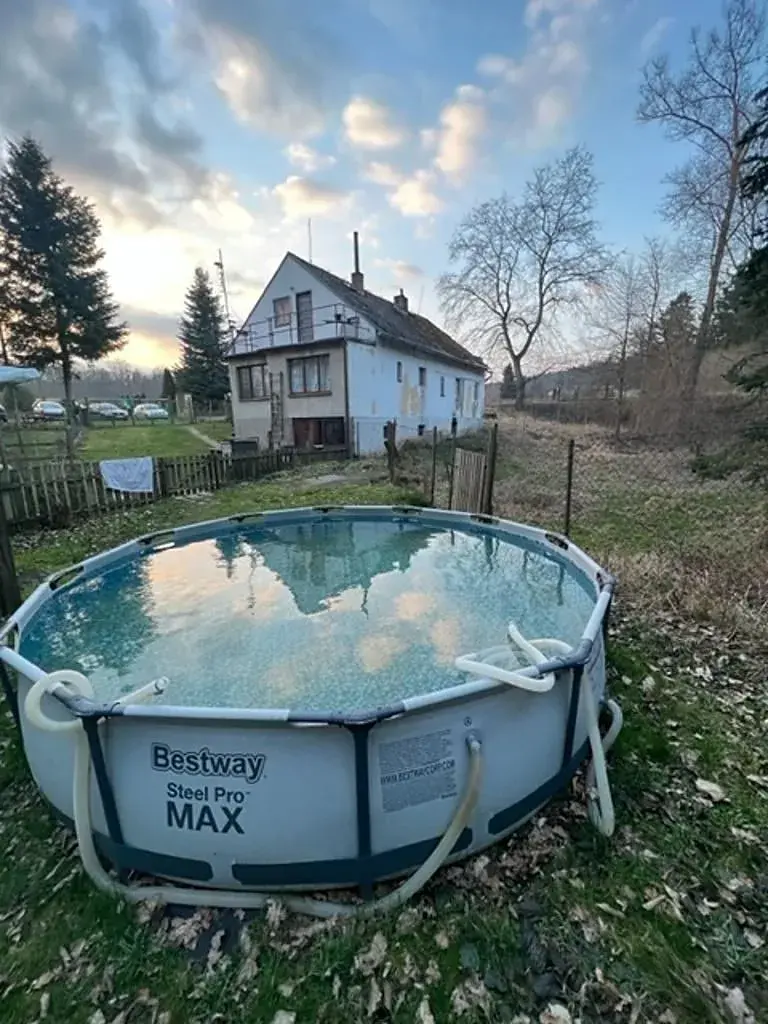 Na pozemku stodola 60m2 a na ni navazující pergola s posezením 20m2, u pergoly nadzemní bazén.