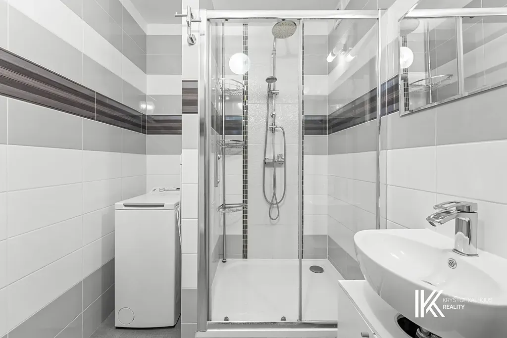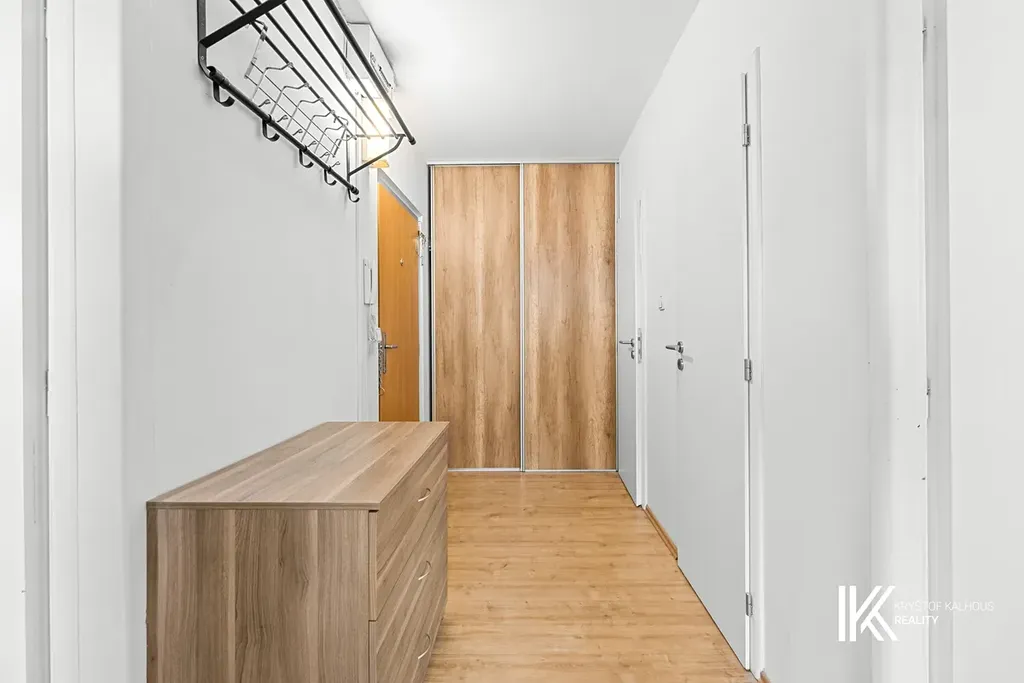 Byt je orientovaný na západ do klidného vnitrobloku. Obývací pokoj s kuchyňským koutem nabízí příjemný, funkčně členěný prostor. Kuchyň je praktická, se dvěma částmi linky, vestavěnými spotřebiči (sklokeramická varná deska, trouba, digestoř, myčka) a dostatkem úložných míst. Menší z pokojů pojme vše potřebné – postel, noční stolek i malou skříň. Druhý pokoj je větší a flexibilní, vhodný jako dětský pokoj, pracovna či pokoj pro hosty; z něj je vstup na lodžii, která bude navíc v roce 2026 kompletně zasklena. Koupelna je moderní se sprchovým koutem a pračkou; toaleta je samostatná a má bidetovou spršku. Byt má také praktickou vstupní předsíň, kde se nachází vestavěná skříň a je zde prostor na botník i věšáky. Další úložné prostory pak nabízí sklepní kóje o velikosti cca 2 m² v suterénu domu, která je součástí jednotky.