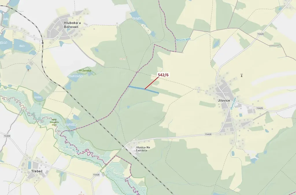 Lesní pozemek o výměře 13 375 m2, parcelní číslo 542/6, podíl 1/1, katastrální území Jílovice u Trhových Svinů, obec Jílovice, obec s rozšířenou působností Trhové Sviny, okres České Budějovice, Jihočeský kraj. Částečně po těžbě.