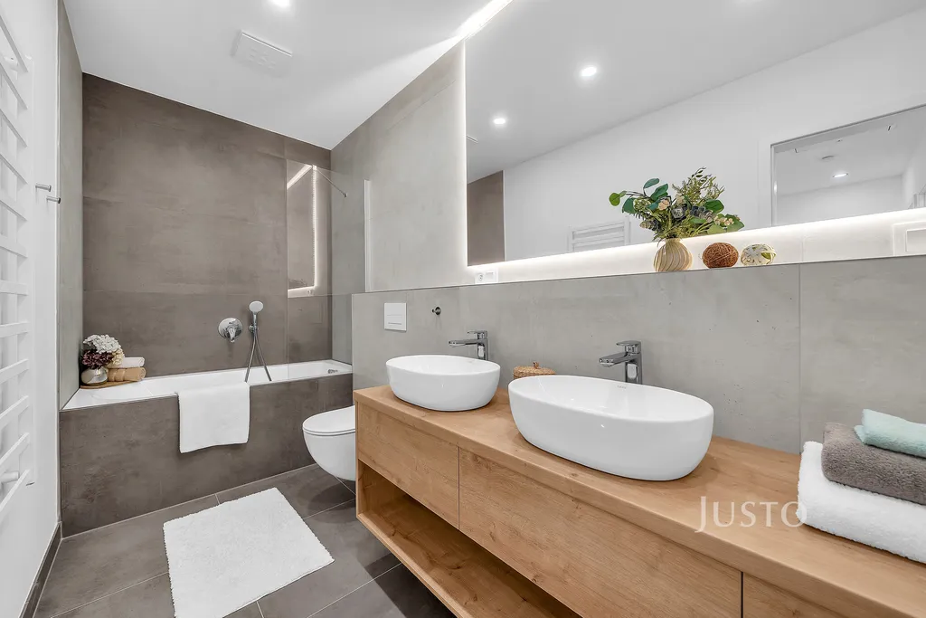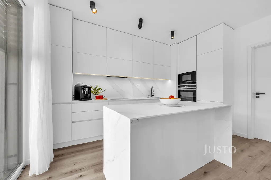 - nadstandardní kuchyňská linka na míru od truhláře, s velkým ostrůvkem (úložný prostor + vyvedená elektřina) a vestavěnými spotřebiči Siemens