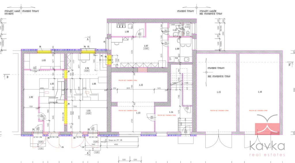 Dispoziční členění: 1.NP - (provoz č. 1) - hala, chobba-zázemí, balíkový sklad, zázemí přepážek, balíková přepážka, univerzální přepážky, zázemí, šatna, denní místnost, předsíň, WC, (provoz č. 2) - prostor prozatím bez využití, prostor prozatím bez využití, chodba a schodiště do 2.NP, (provoz č. 3) garáž, (provoz č. 4) garáž. Dispoziční členění: 2.NP - (provoz č. 5) – byt 2+1 – chodba, kuchyň, WC, koupelna, pokoj č. 1 pokoj č.2.