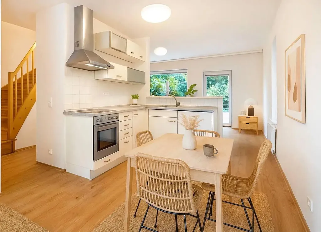 Byt se pronajímá částečně vybavený, k dispozici je moderní kuchyňská linka se spotřebiči. V přízemí se nachází útulný obývací prostor spojený s kuchyní, odkud je přímý vstup na terasu a do zelené zahrady. Dále zde najdete koupelnu a vstupní halu. V horním patře jsou tři samostatné pokoje a druhá koupelna, takže byt nabízí dostatek prostoru i soukromí.