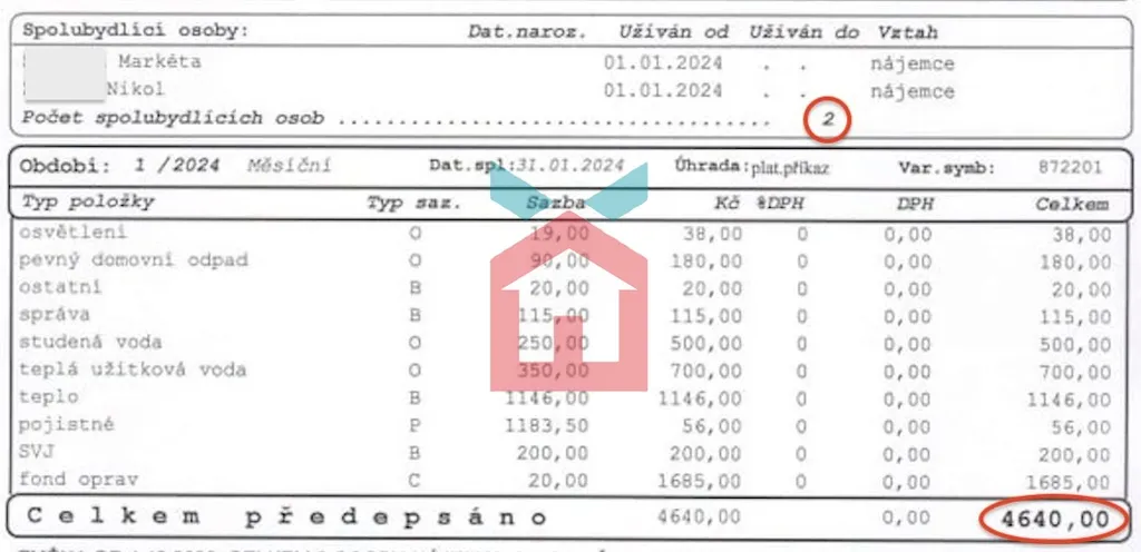 Kompletní poplatky a náklady jsou na dvě osoby 4.640,-. CZK. Samotný fond oprav 1.685,- CZK (velmi nízké), což značí, že společenství vlastníků nebude mít žádné dluhy. Dům je po kompletní revitalizaci, střecha, zateplení, chodby, sklepy, výtah, stoupačky a jiné. Dům je rovněž opatřen čipovými zámky a bezpečnostními kamerami. Všude čisto a klid.