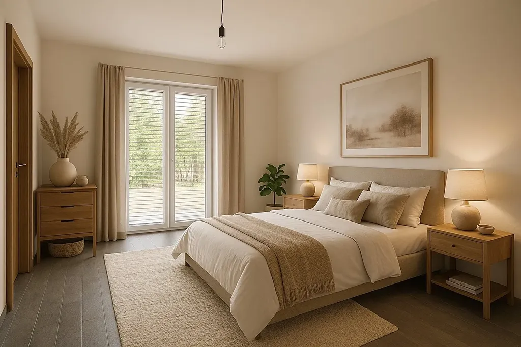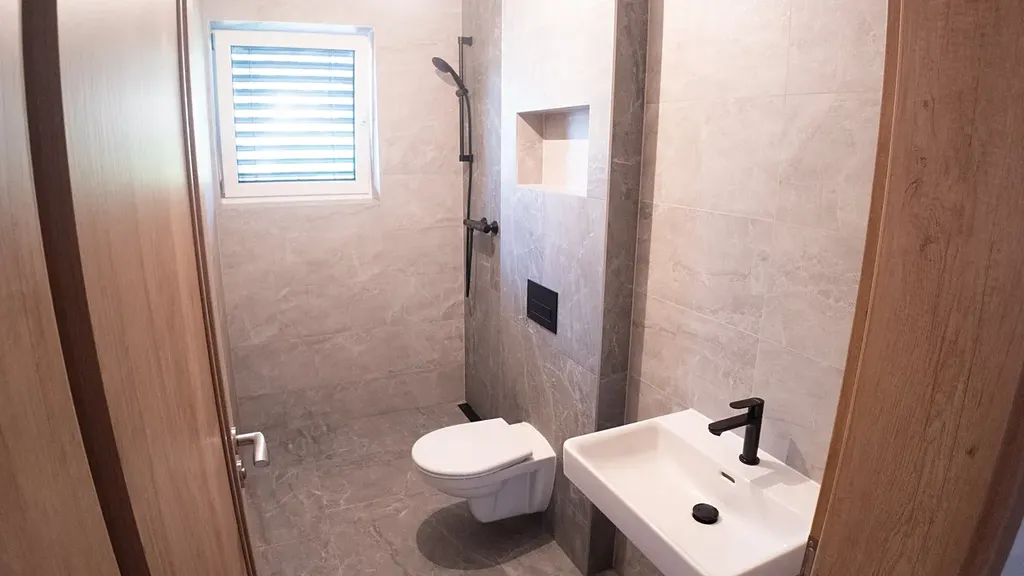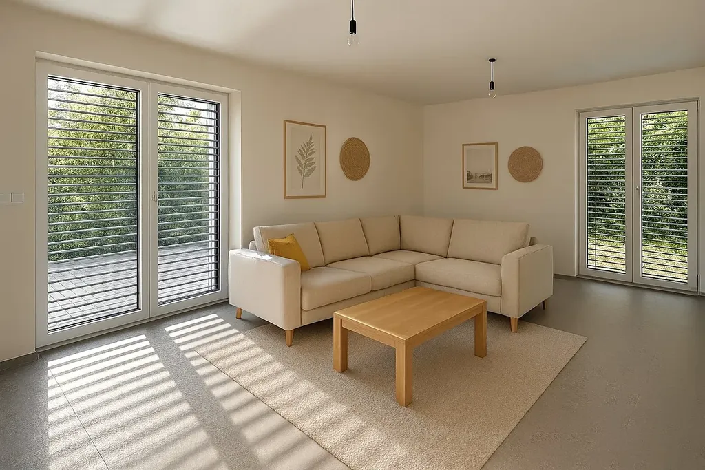 Budova je postavena z kvalitní cihly Ytong o tloušťce 30 cm, což zajišťuje vynikající tepelně izolační vlastnosti, a je zateplena polystyrenem o tloušťce 220 mm. Střecha je sedlová s vazníkovou konstrukcí a betonovou krytinou Bramac, která zaručuje dlouhou životnost a odolnost. Stropy jsou ze sádrokartonových podhledů zateplené 500mm foukanou izolací Rockwool. Strojové betonové podlahy o tloušťce 40-60mm zateplené 180mm podlahovým polystyrenem s podlahovým vytápěním. Projekt počítá s energetickou třídou B, což znamená nízké náklady na vytápění a energetickou náročnost. Vytápění a ohřev vody je řešeno moderním tepelným čerpadlem vzduch-voda, což je ekologické a ekonomické řešení pro každodenní komfort. Druhý zdroj tepla je příprava na krbová kamna, která zajistí příjemnou atmosféru v obývacím pokoji spojeným s kuchyňským koutem. Dále jsou v domě instalována kvalitní plastová okna s trojskly v antracitové barvě, doplněná o předokenní žaluzie s motorovým pohonem, což přispívá k vyšší energetické úspoře a komfortu užívání. Koupelny jsou obloženy kvalitními obklady a dlažbou v barvě matného betonu, osazená sanita v nadstandardní kvalitě značky LAUFEN, SANTECH A GROHE. Krytina podlah celého domu je z vinylu Experto click plus. Interiérové dveře a obložky značky Doornite. Strojové vnitřní omítky sádrové.