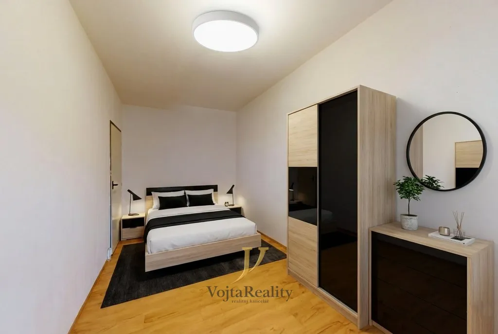 Byt je po částečné rekonstrukci. Byly provedeny nové obložky a interiérové dveře, položeny plovoucí podlahy, zrekonstruována elektroinstalace v kuchyni a koupelně a vybudována zcela nová koupelna. Dispozičně je řešen velmi prakticky – ze vstupní chodby je přístup do koupelny s WC, umyvadlem, vanou a místem pro pračku. Na chodbu navazuje prostorný obývací pokoj, ze kterého se vchází do kuchyně vybavené linkou se spotřebiči a dále také do samostatné ložnice. Součástí bytu je i sklepní kóje, která nabízí dostatek úložného prostoru. V inzerci jsou použity vizualizace možného vybavení. Byt se pronajímá nevybavený.