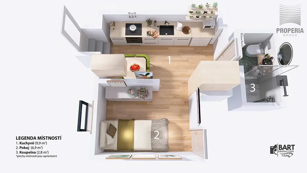 Dispozici tvoří hlavní obytný prostor s kuchyňskou linkou a posezením a koupelna se sprchovým koutem a WC. Byt se pronajímá kompletně vybavený, stačí se pouze nastěhovat.