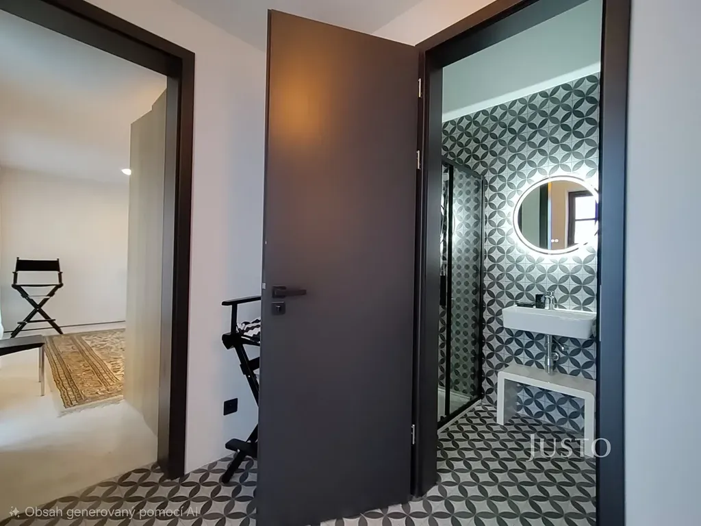 Kuchyně je netradičně schovaná za posuvnými dveřmi, které se dají zcela zavřít a vytváří tak dojem skříně, byt má podlahové vytápění v celém prostoru a velká ateliérová okna.
