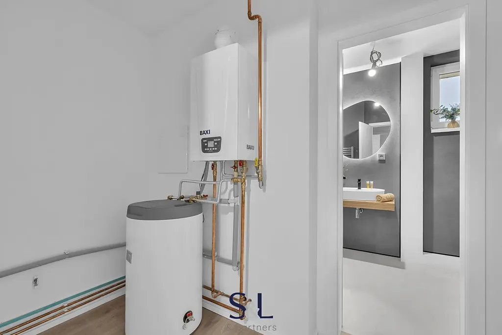 K bytu náleží také sklep a sklepní kóje. Vytápění i ohřev vody zajišťuje moderní kombinovaný plynový kotel. Rekonstrukce je kompletní a to od elektroinstalace, vytápění, podlah, sanitárního zařízení, kuchyňské linky až po instalaci podhledů a odizolováním od půdy.