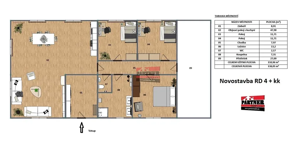 Dům nabízí celkovou plochu 138,08 m². Dispozice je prakticky řešená: prostorné zádveří (8,91 m²), světlý obývací pokoj s kuchyňským koutem (47,98 m²) a přímým vstupem na terasu, tři samostatné pokoje (11,71 m², 11,71 m² a 13,2 m²), praktická chodba (7,97 m²) s druhým vstupem do domu, koupelna se sprchovým koutem (7,31 m²) a samostatná toaleta (2,17 m²). Kvalitní vinylové podlahy podtrhují moderní a příjemnou atmosféru interiéru. Součástí domu je také přístřešek o velikosti 27,09 m² a zahradní domek o výměře 19 m². Celý pozemek o rozloze 1 332 m² je kompletně oplocený a opatřený elektrickou vjezdovou bránou.