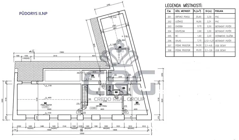 Celková plocha nemovitosti činí 1.480 m2, z toho zastavěná plocha a nádvoří je dle Listu vlastnictví 702 m2 a zahrada má výměru 778 m2. V přízemí se nachází bytová jednotka o dispozici 4+KK se dvěma koupelnami o výměře cca 165,40 m2. V podkroví se nachází nedokončená bytová jednotka o dispozici 2+kk se dvěma půdami o výměře cca 152,90 m2. Z toho samostatná jednotka má výměru cca 53,90m2 a obě půdy o celkové výměře cca 99 m2.