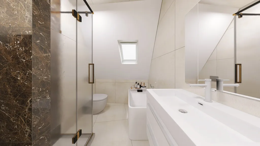 • Kvalitní standardy – SPC podlahy v dekoru dřeva, kvalitní obklady a dlažby + sanita