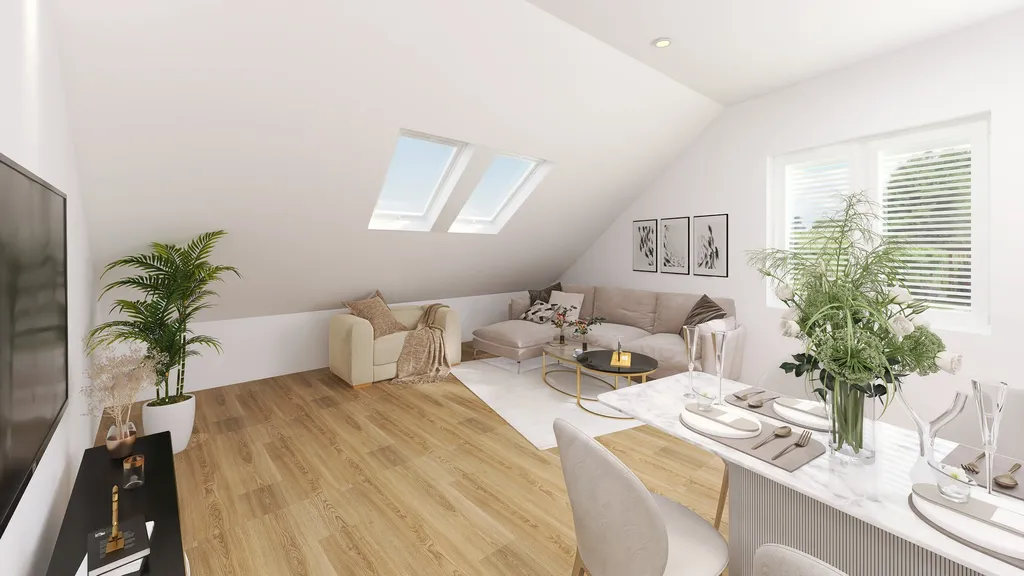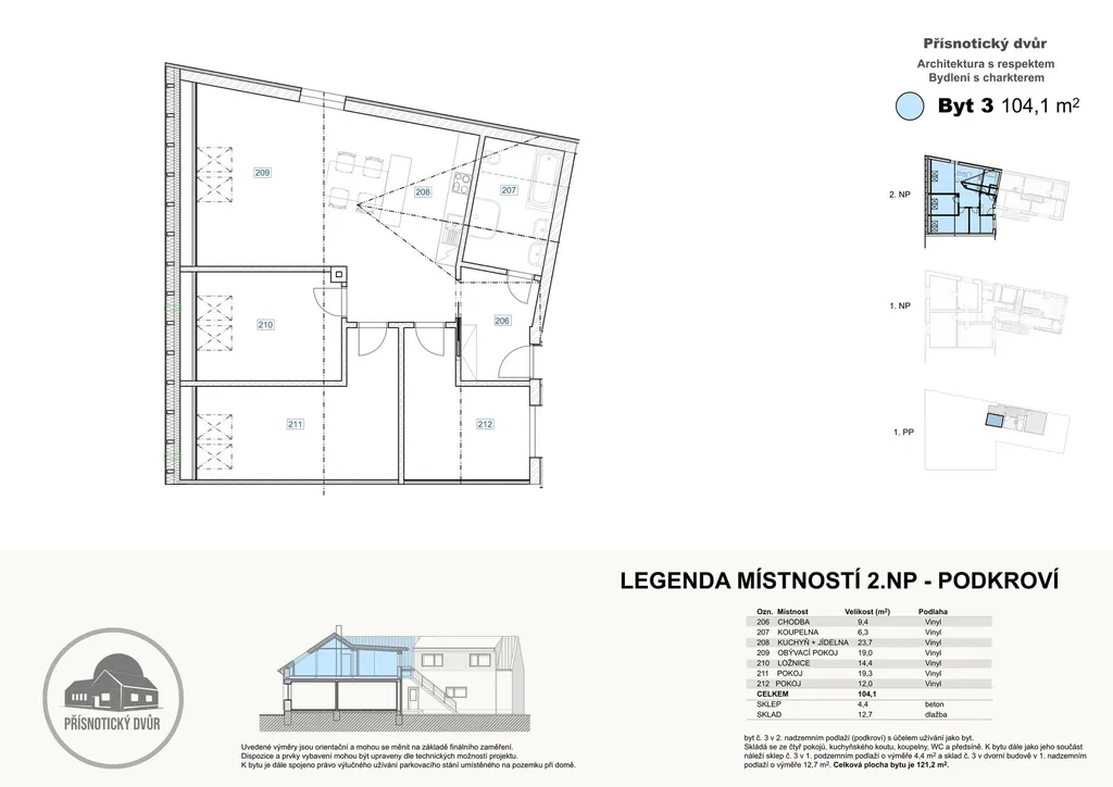 Největší z nabízených jednotek 4+KK – se jménem Florián disponuje užitnou plochou 104 m², rozvrženou v podkroví. K bytu náleží navíc sklep 4,4 m² a venkovní sklad 12,7 m², vhodný na spoustu vybavení, kola či jiné. Celková plocha činí úctyhodných 121,2 m² + parkovací místo ve výlučném užívání. Rodinné bydlení v bytě, který je svou dispozici hezky prosvětlený, sestává z prostor: obývacího pokoje s kuchyní (JV) a jídelní částí, zádveří, koupelna s vanou a sprchovým koutem, taktéž prostorem pro sušičku a pračku nad sebou. Dále dispozici tvoří 3 samostatné pokoje orientované taktéž na JV a jeden pokoj s výhledem na západní stranu. Pokoje poskytují příjemné světlo bez přehřívání v létě. K vyššímu komfortu přispívá vnitřní klimatizační jednotka doplněná o venkovní jednotku. Výhodou je i samostatný vstup ze zadní části budovy, pouze k tomuto bytu.