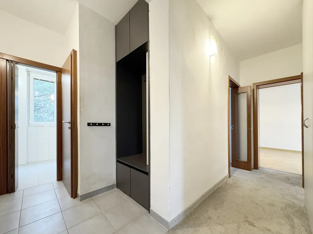 Obývací pokoj s kuchyní a lodžií má celkovou rozlohu 29 m2, pokoje potom 6,8, a 12 m2. Ve dvou dětských pokojích jsou koberce, v ložnici a obývacím pokoji plovoucí podlaha. Dva pokoje a předsíň disponují celkem třemi vestavěnými skříněmi. WC je samostatné, v koupelně je vana opatřená sprchovací zástěnou. V celém bytě jsou dřevěné zárubně a dveře s jednotným dekorem. Prostorná kuchyně s velkým oknem je opatřena kuchyňskou linkou ve tvaru U, je vybavena lednicí Liebherr, digestoří Zanussi, myčkou Bosch, el. troubou a sklokeramickou deskou Fagor. Obývací pokoj má lodžii orientovanou na jih. K bytu náleží samostatná garáž v přízemí domu o rozloze 19 m2.