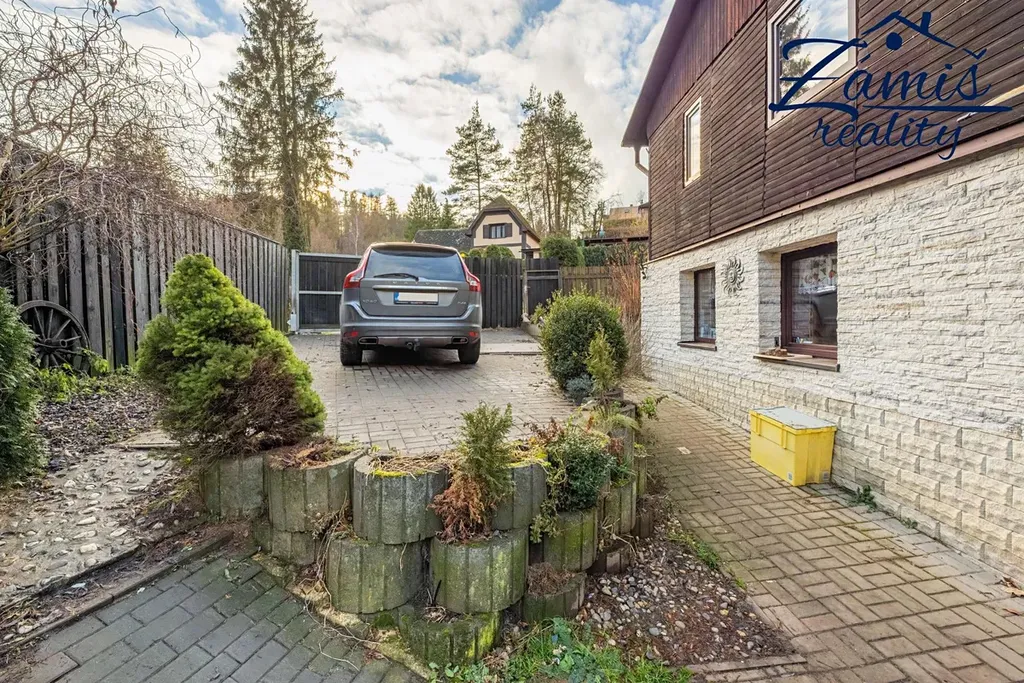 Na pozemku je vybudováno zpevněné parkovací stání až pro 2 auta, vjez má automatická vrata na dálkové ovládání.