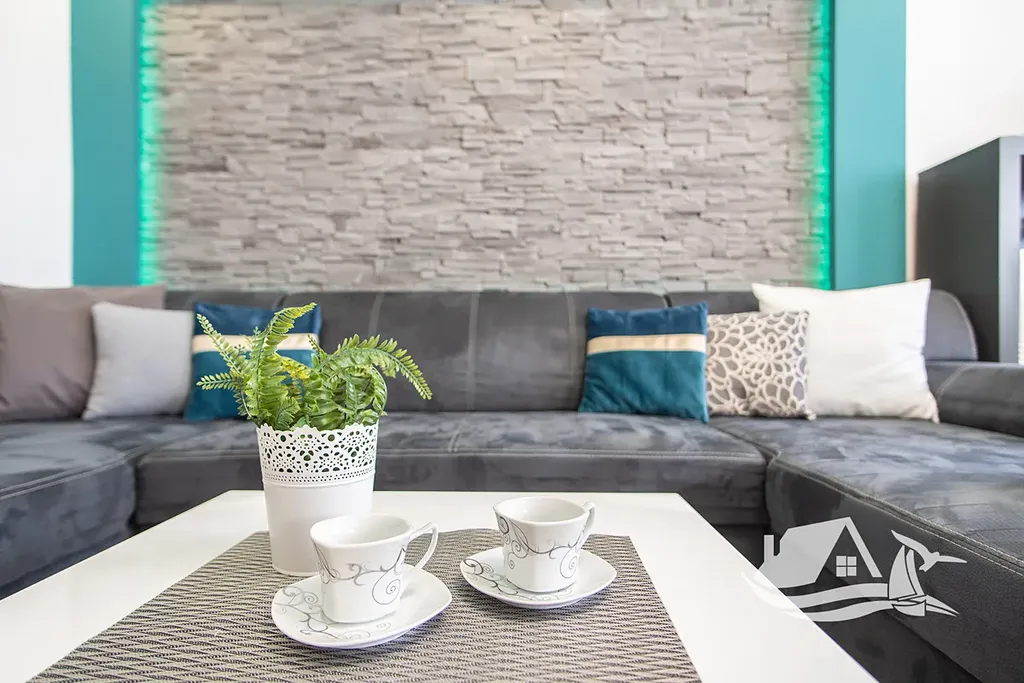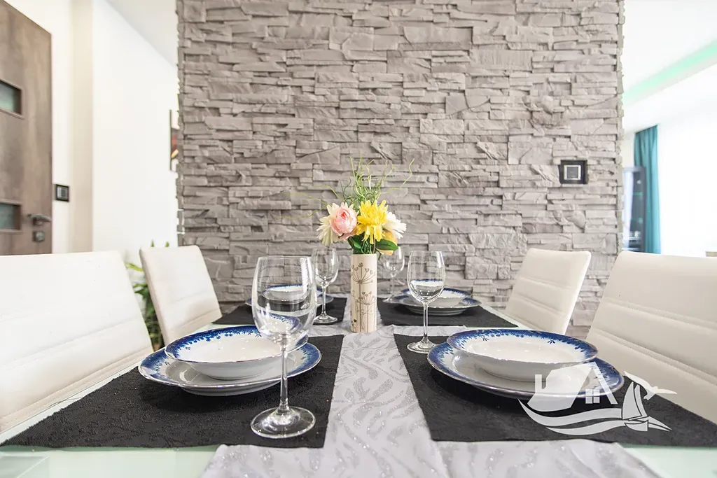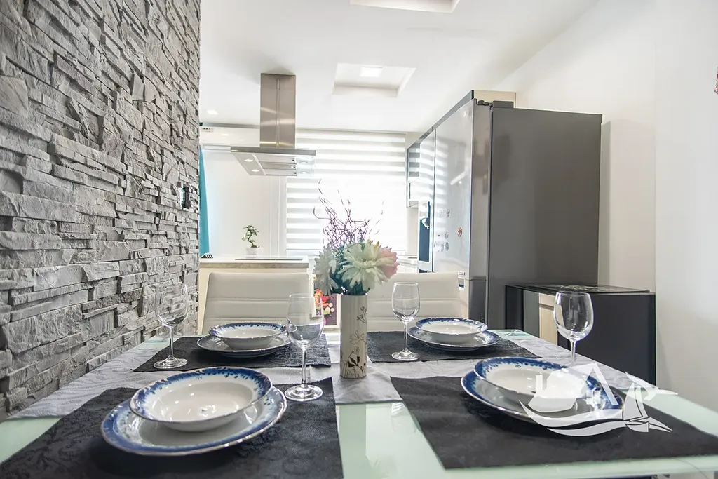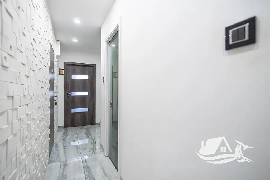 Interiér bytu je navržen s citem pro detail a odolnost materiálů, v kuchyni i koupelně najdete luxusní obklady a sanitu, v obývacím pokoji a ložnicích kvalitní vinylovou podlahu, která si zachovává vzhled dřeva a přitom vydrží každodenní provoz.