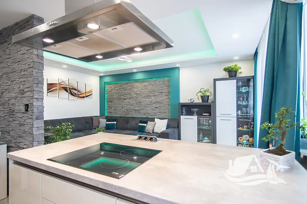 Během kompletní rekonstrukce prošly bytem nové elektroinstalace, vodovodní rozvody a snížené stropy s diskrétním LED osvětlením ve všech místnostech, díky čemuž prostor působí vzdušně a moderně až na míle daleko.