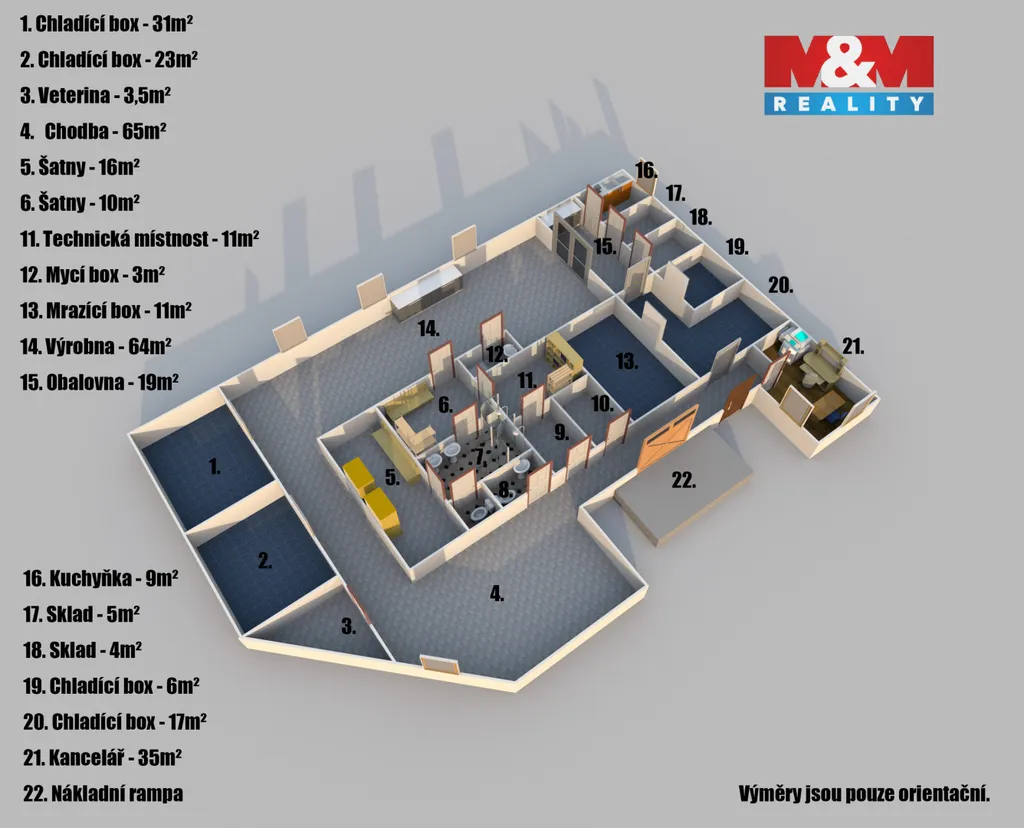 Nabízíme k prodeji výrobní objekt o užitné ploše 377 m2, který se nachází v obci Potvorov, okr. Plzeň-sever. Budova a prostory sloužily ke kompletnímu zpracování zvěřinového masa. Objekt je vybaven k tomuto nebo podobnému účelu a má všechny hygienické a veterinární certifikáty (Cztko, HACAP, veterinární audity vždy v pořádku). Je možné koupit i s firmou, která objekt a zpracování provozuje. Možnost využít jako univerzální skladové prostory nebo skladování termolabilního zboží. Součástí budovy je kancelářský prostor, expediční místnost, expediční chladící box, dva velké chladící boxy, mrazák, výrobní hala s bourárnou, kuchyňka, čistá/špinavá šatna, sprchy + WC, sklad technických prostředků, nerezové bezdotykové baterie, nerezové vybavení bourárny a další vybavení. Objekt je napojen na veřejný vodovod a odpad sveden do jímky (je možno napojit na veřejnou kanalizaci). Kancelář a šatny jsou vytápěny el. přímotopy a ohřev vody bojlerem. Rozloha pozemku je 603 m2. CENA K JEDNÁNÍ!