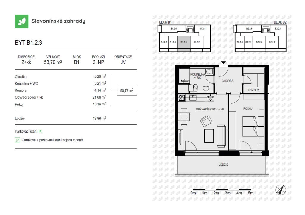Nabízíme prostorný byt s označením B1.2.3 o dispozici 2+kk, podlahové ploše 53,68 m2 v 2. NP, s balkónem 13,6 m2 ideální pro páry nebo jako investiční bydlení.
