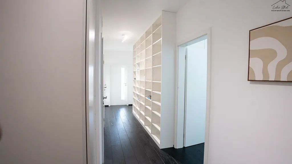 Praktická stránka života tady je promyšlená do detailu. V bytě je samostatná komora, kam se pohodlně vejde pračka, sušička, kolo i další věci, které nechcete mít na očích. Další úložný prostor poskytují vestavěné skříně. Na rozdíl od ostatních bytů v domě se tento může pochlubit nadstandardními podlahami z masivního dřeva v tmavém tónu, které vznikly jako součást klientských změn, což dodává interiéru pocit poctivé kvality.