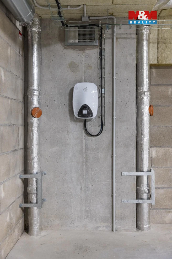 K bytu patří garážové stání přímo u vchodu s elektrickou nabíječkou pro elektromobil. Byt má velmi nízké provozní náklady, vytápění je dálkové, napojení na veřejnou kanalizaci a k dispozici jsou přípojky 230 V a 400 V.
