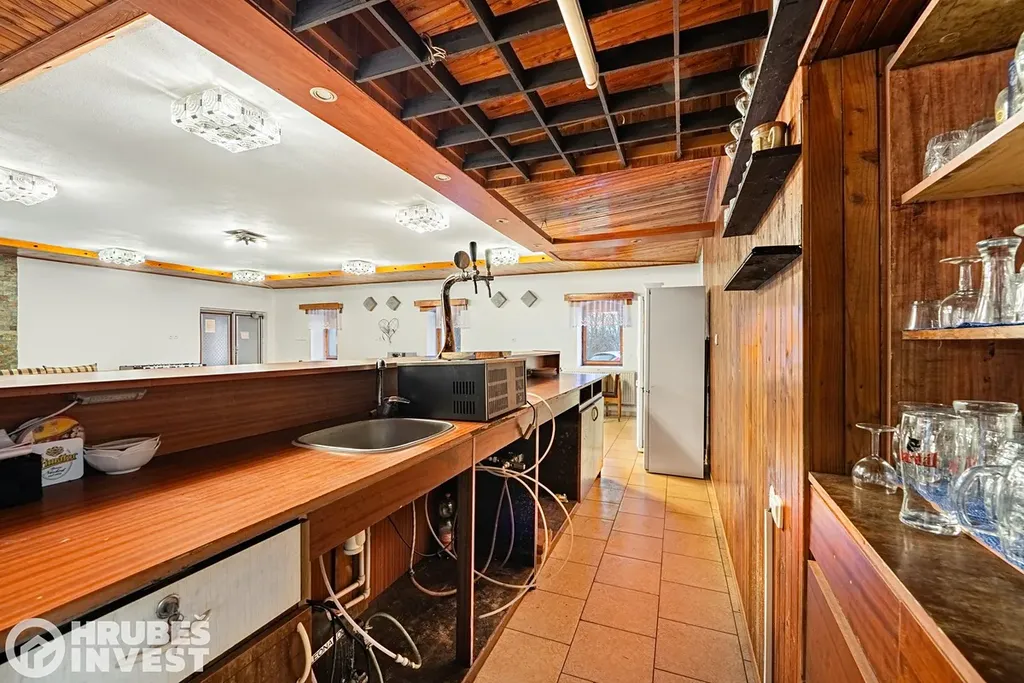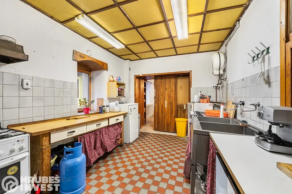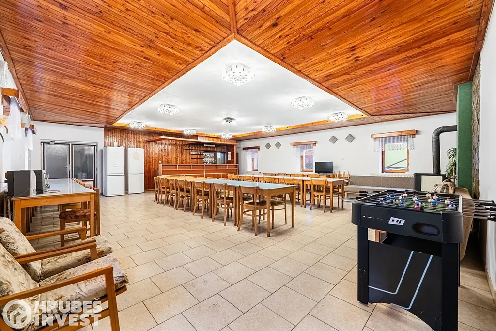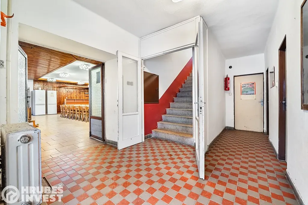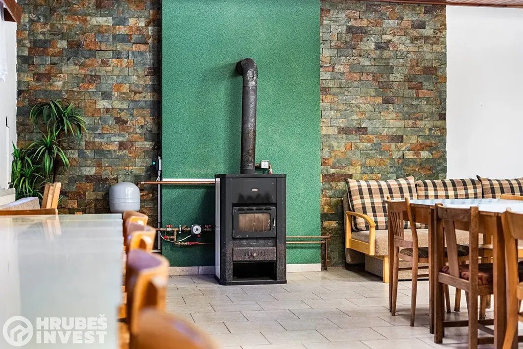 V přízemí se nachází vstupní chodba, dva sklady, kuchyň, prostorný společenský sál s barem a krbovými kamny, dámské a pánské toalety, sprchový kout a technické zázemí.