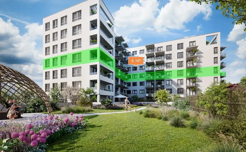 Byt 1+kk o velikosti 29,8 m2 + balkon 4,6 m2 se nachází ve 4. nadzemním podlaží (z celkových sedmi) s orientací na sever.
