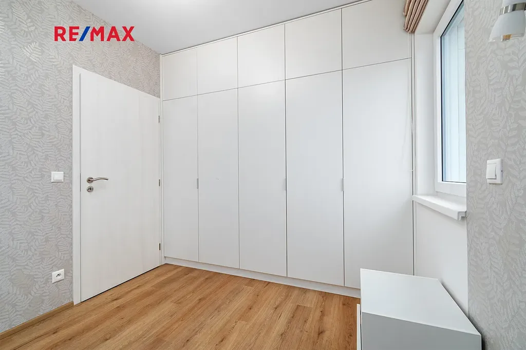 V chodbě nalezneme prostornou vestavěnou šatní skříň a vstup do obývacího pokoje spojeného s kuchyňským koutem, kde nalezneme moderní nadstandardní kuchyňskou linku a také na míru vyrobenou obývací stěnu.
