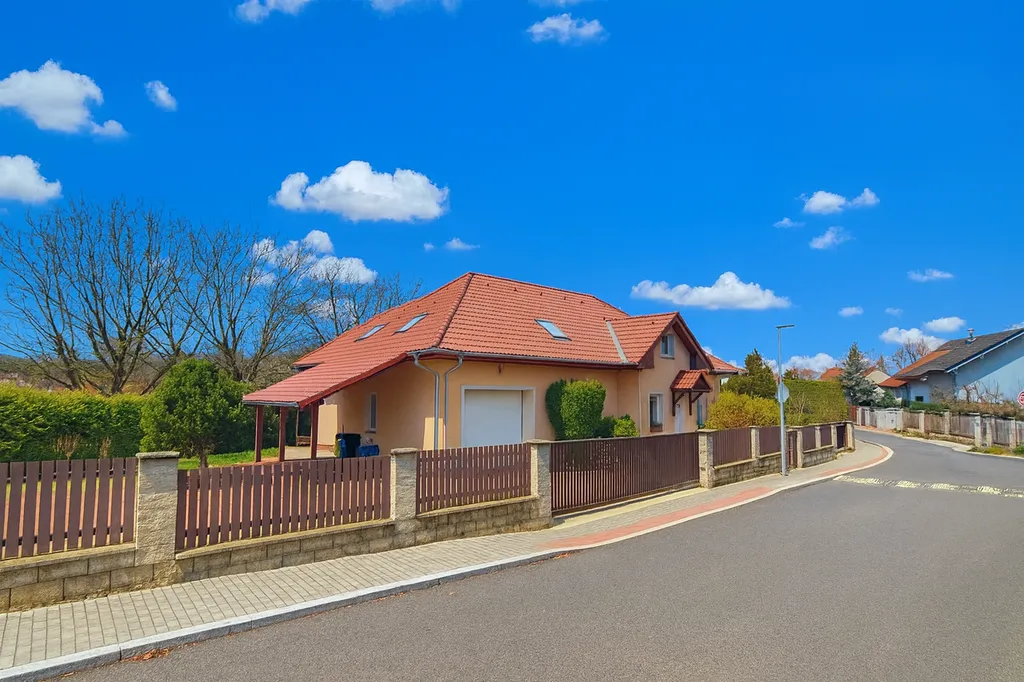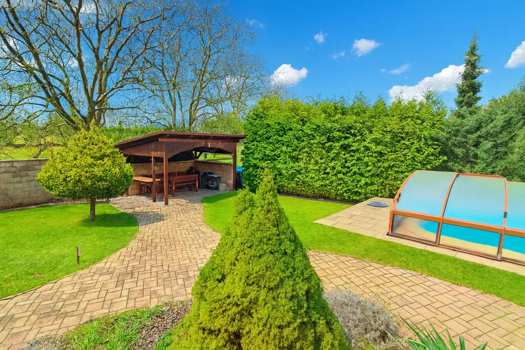 Zahrada je pečlivě udržovaná a orientovaná na jižní stranu, což zajišťuje dostatek světla po celý den. K odpočinku i letním radovánkám slouží krytý bazén, venkovní terasa a pergola nabízející příjemné posezení. Součástí zázemí je garáž pro dva vozy s technickým prostorem, přístřešek pro jedno auto a další parkovací stání přímo na zahradě pozemku.