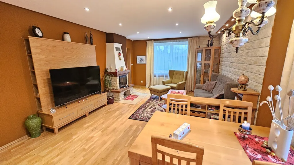 Srdcem domu je prostorný obývací pokoj s krbem a přímým vstupem na terasu, na který plynule navazuje plně vybavená kuchyně. V každém podlaží je k dispozici koupelna s toaletou. Vytápění i ohřev vody zajišťuje plynový kotel.