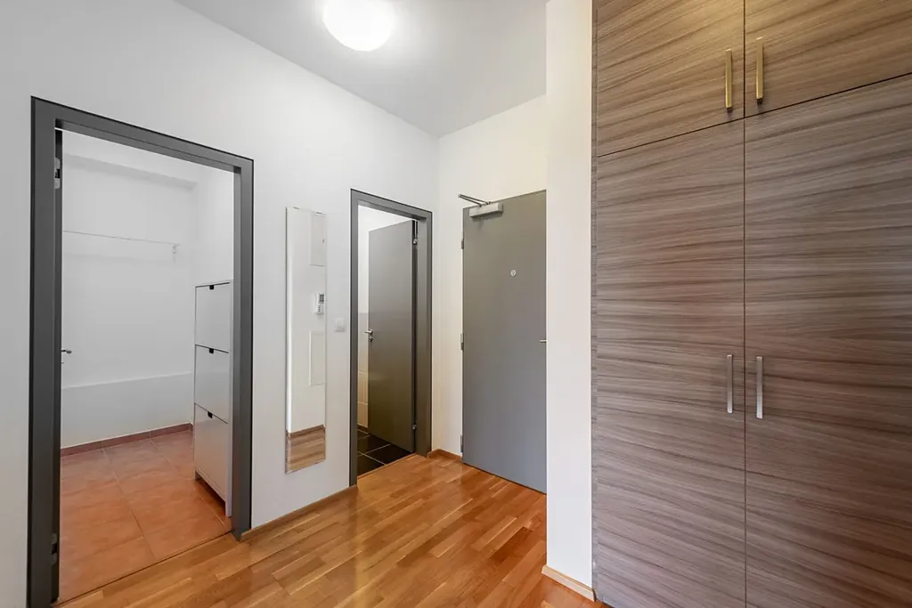 vestavná skříň nacházející se v chodbě. Na podlahách jsou dubové