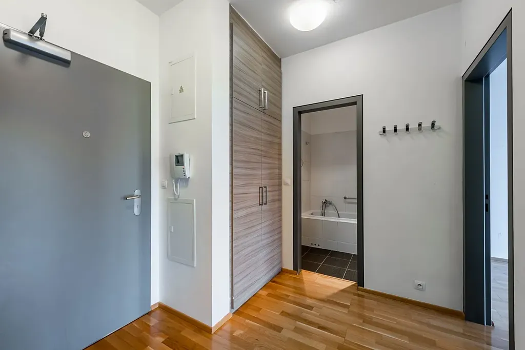 Byt je dále vybaven intercomem, bezpečnostními dveřmi a vnějšími