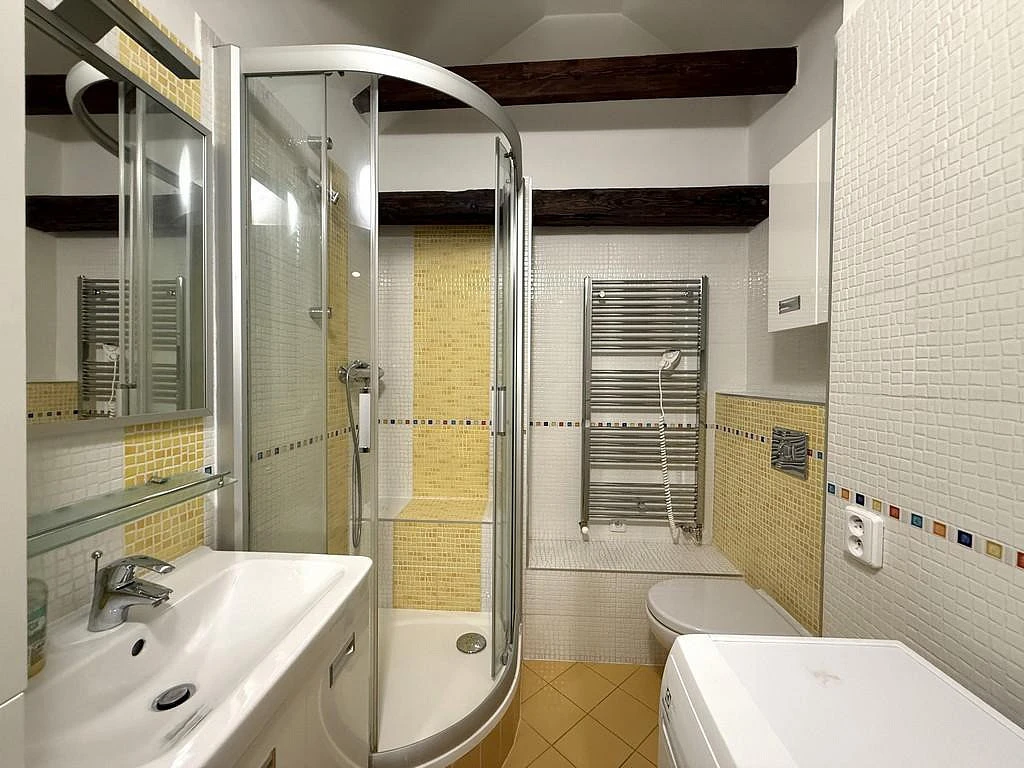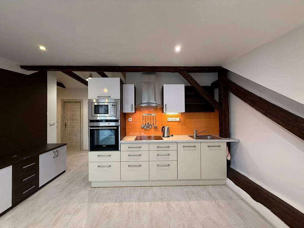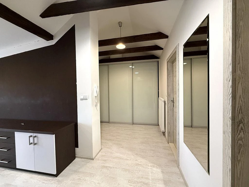 Byt se nachází ve 2. patře řadového domu. Po vstupu do bytu se nachází schodiště a prostorná předsíň o velikosti cca 18,67 m, vybavená praktickou skříní. Z předsíně vede chodba o výměře cca 5,57 m, kde je umístěna velká vestavěná skříň a elektrický kotel. Z chodby je vstup do všech místností. Byt nabízí dva samostatné neprůchozí pokoje o výměrách cca 10,29 m a 9,98 m. Oba pokoje jsou nevybavené, připravené k zařízení dle vašich představ. Moderní koupelna o velikosti cca 3,19 m je vybavena sprchovým koutem, umyvadlovou skříňkou a pračkou. Dominantou bytu je krásný obývací prostor s kuchyňským koutem o výměře cca 19,80 m. Kuchyňský prostor zaujme přiznanými dřevěnými trámy, které dodávají interiéru jedinečnou atmosféru. Kuchyňská linka je plně vybavena vestavěnými spotřebiči: mikrovlnnou troubou, elektrickou troubou, myčkou, keramickou varnou deskou, digestoří, lednicí i mrazákem. Z kuchyně je přímý vstup na prostornou terasu o velikosti 9,14 m, ideální pro relaxaci, venkovní posezení nebo pěstování květin.
