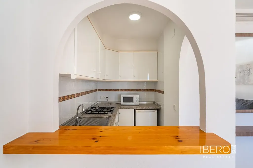 Do apartmánu se vchází po levé straně, kde se nachází kuchyň a před ní obývací pokoj s jídelnou a vstupem na terasu, odkud si můžeme vychutnat neuvěřitelný panoramatický výhled na skálu Ifach Calpe. Na stejném patře najdeme koupelnu a 2 ložnice.