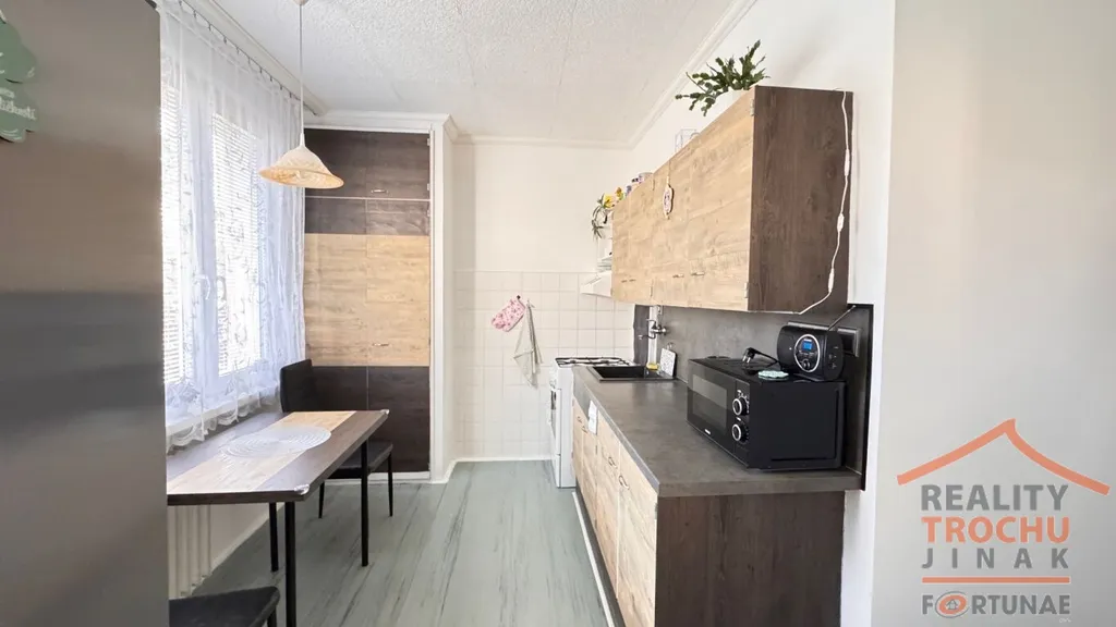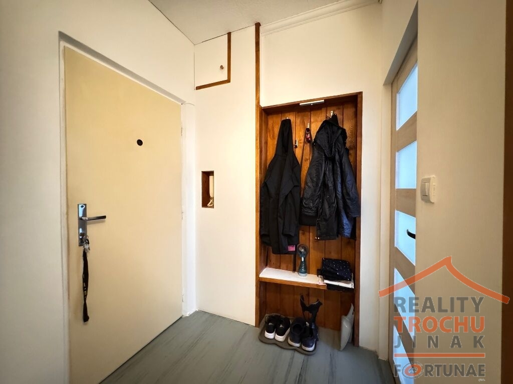Dispozice: 1 obytná místnost se vstupem na lodžii (3,5 m2), kuchyňský kout s jídelnou, koupelna (vana), samostatné WC, chodba (vestavěné skříně), sklepní kóje. Topení: ÚT – dálkové.