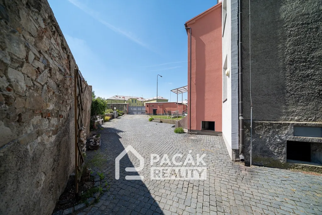 V přední části pozemku u veřejné komunikace se na rovinatém pozemku nachází hlavní stavba rodinného domu se zastavěnou plochou 254m2. Objekt je celý podsklepený, má 2 obytná podlaží se světlou výškou 330cm a půdou, vhodnou pro zbudování podkroví. Současná dispozice domu nabízí na každém patře samostatný velkometrážní byt s výměrou cca 190m2. Historie spadá do roku 1933, kdy na přelomu tisíciletí byl rodinný dům adaptován do současné podoby. Byla vyměněna krytina na střeše, nové rozvody, omítky, podlahy, okna i fasáda. Stavba působí velice důstojným dojmem. Nabízí prostorné neprůchozí místnosti a široké chodby. Přístup k objektu i pro nákladní automobily.