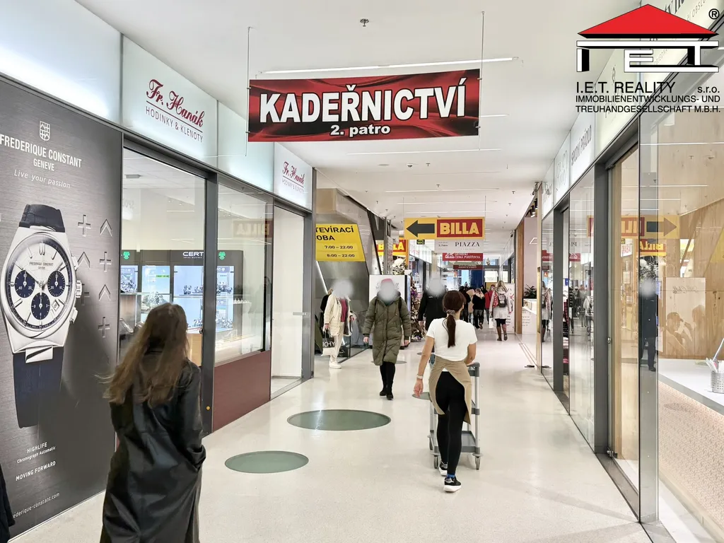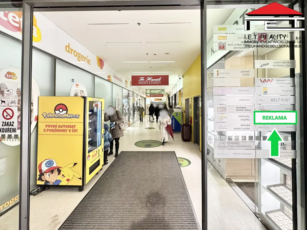 Nabízený obchod má praktický obdélníkový tvar prodejní plochy, prostornou výlohu, velkou reklamní plochu nad výlohou a náleží k němu i mnoho míst v obchodním centru, na kterých je vyznačena jeho reklama a umístění, viz. vyznačení na fotografiích.