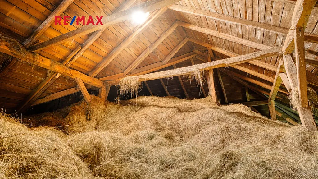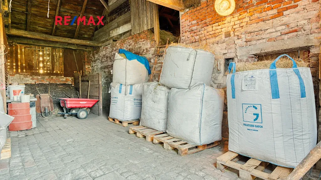 Na dům bezprostředně navazuje velká stodola a další hospodářská část, která tvoří s domem praktický celek. Ve stodole je dostatek prostoru pro uskladnění dřeva na topnou sezónu, parkování techniky, čtyřkolek či zahradních strojů, a zároveň zde najdete klasický seník. Své místo tu může mít i dílna, prostor pro drobné hospodářství nebo kryté stání pro auto. Díky výšce a členění stodoly je zde také potenciál pro případné další využití – např. ateliér, domácí zázemí pro koníčky či sklad pro menší podnikání.