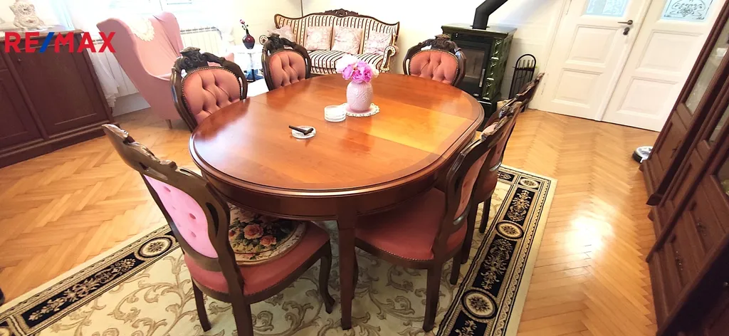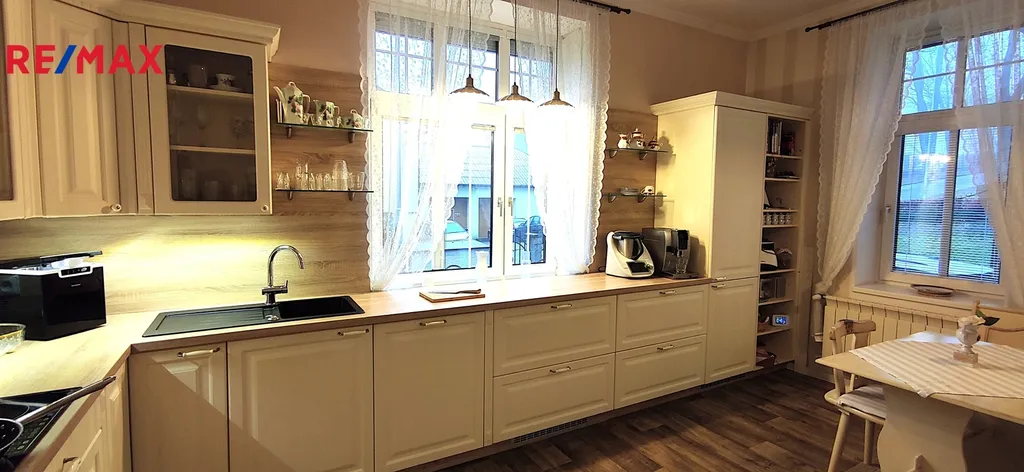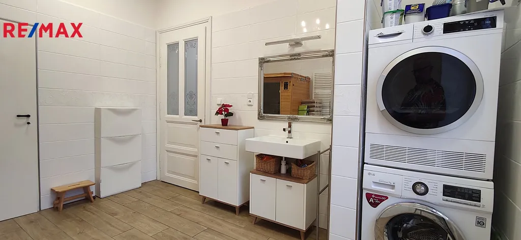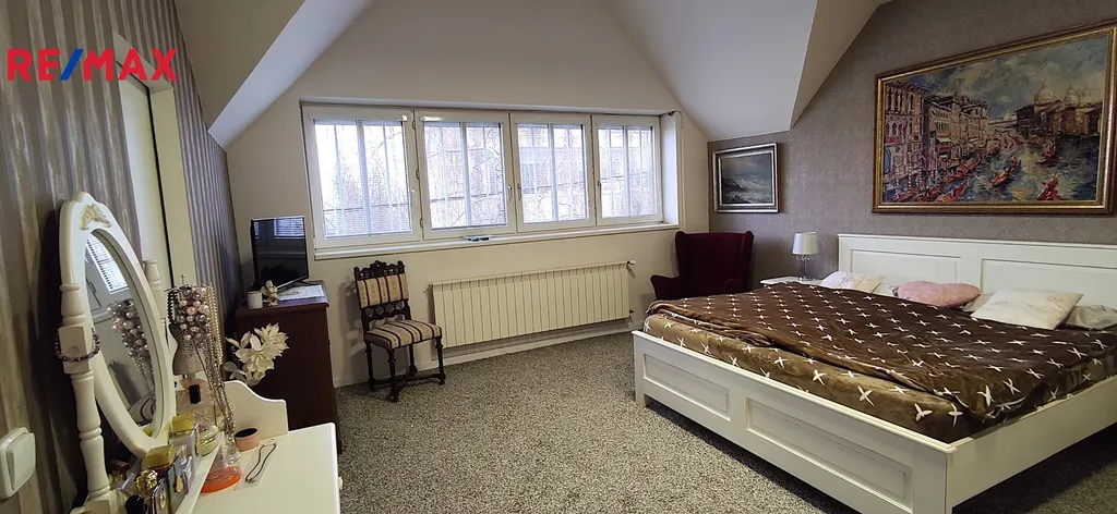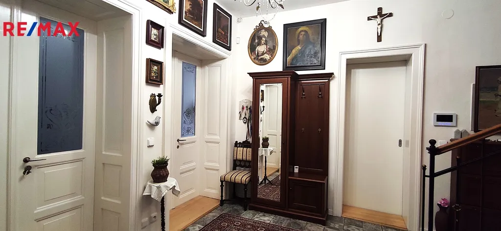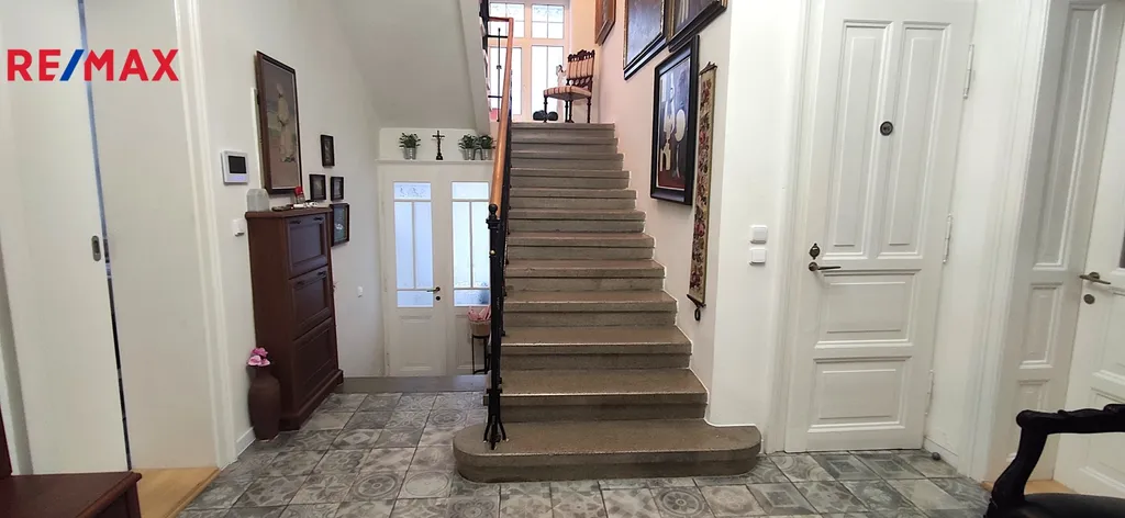 V přízemí je k dispozici prostorná kuchyně, obývací pokoj s kachlovými kamny, druhý velký pokoj s možností podnikání, samostatné wc, koupelna s vanou, saunou a šatnou. Všechny místnosti jsou pohodlně přístupné z prostorné chodby. Ve druhém nadzemním podlaží najdeme dětský pokoj s šatnou, prostornou ložnici se šatnou, menší pokoj pro hosty, pracovnu, samostatné wc a koupelnu se sprchovým koutem. VVše pohodlně přístupné z prostorné chodby. V domě jsou zachovány původní prosklené dřevěné dveře a zárubně, podlahy v pkojích jsou parketové, v chodbách nová dlažba.