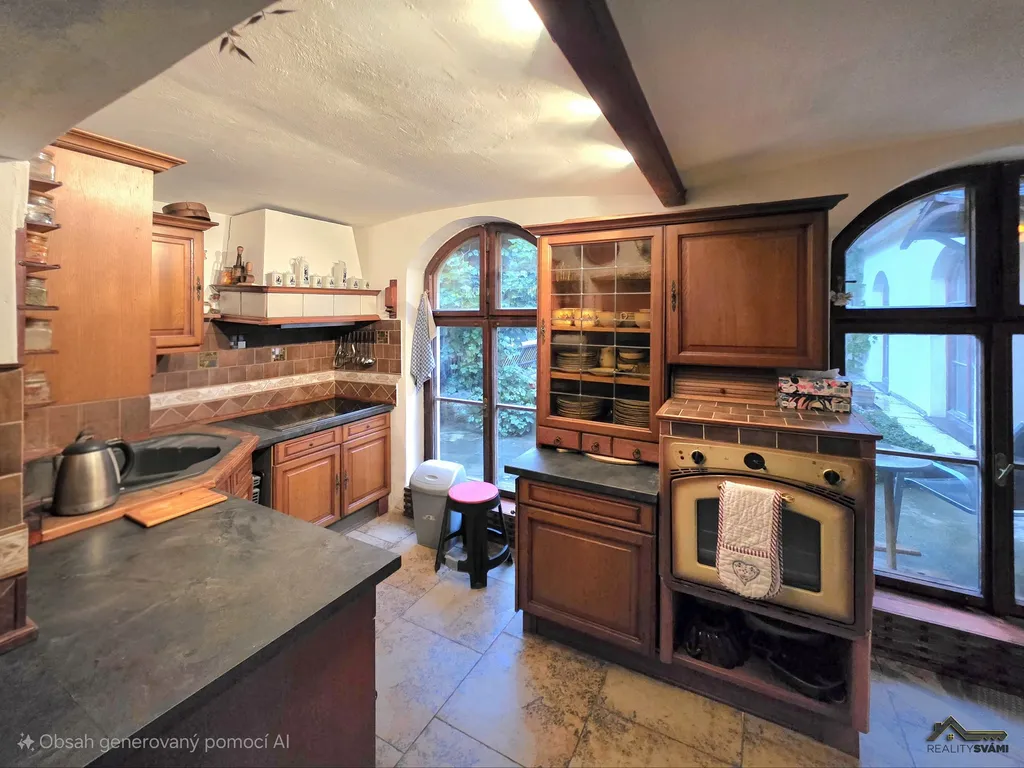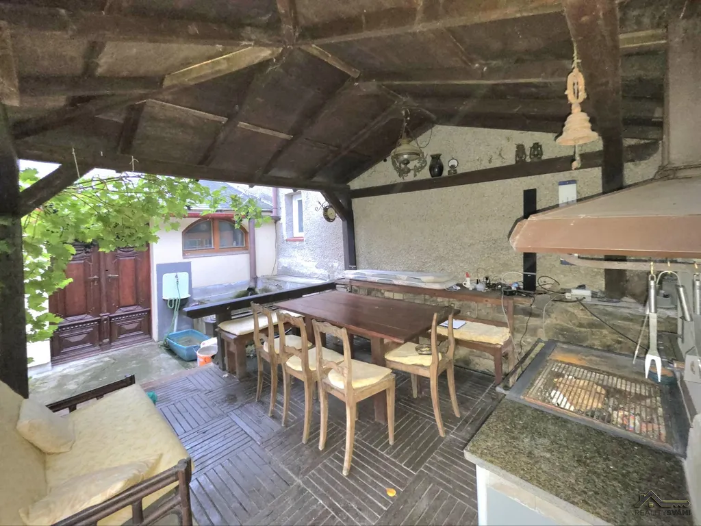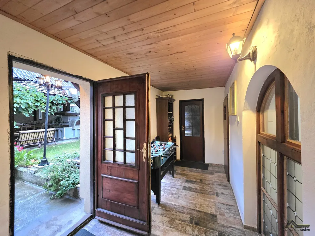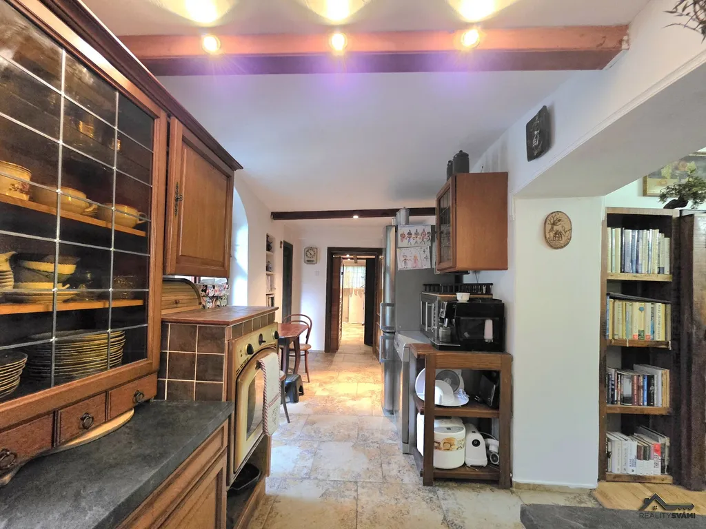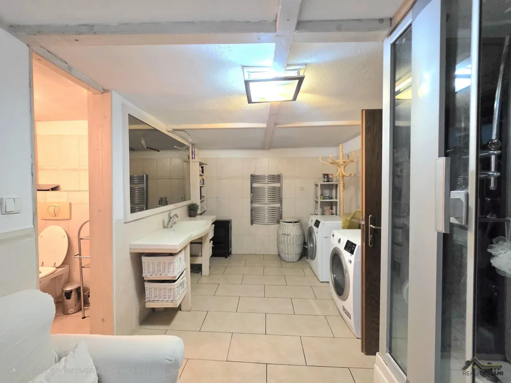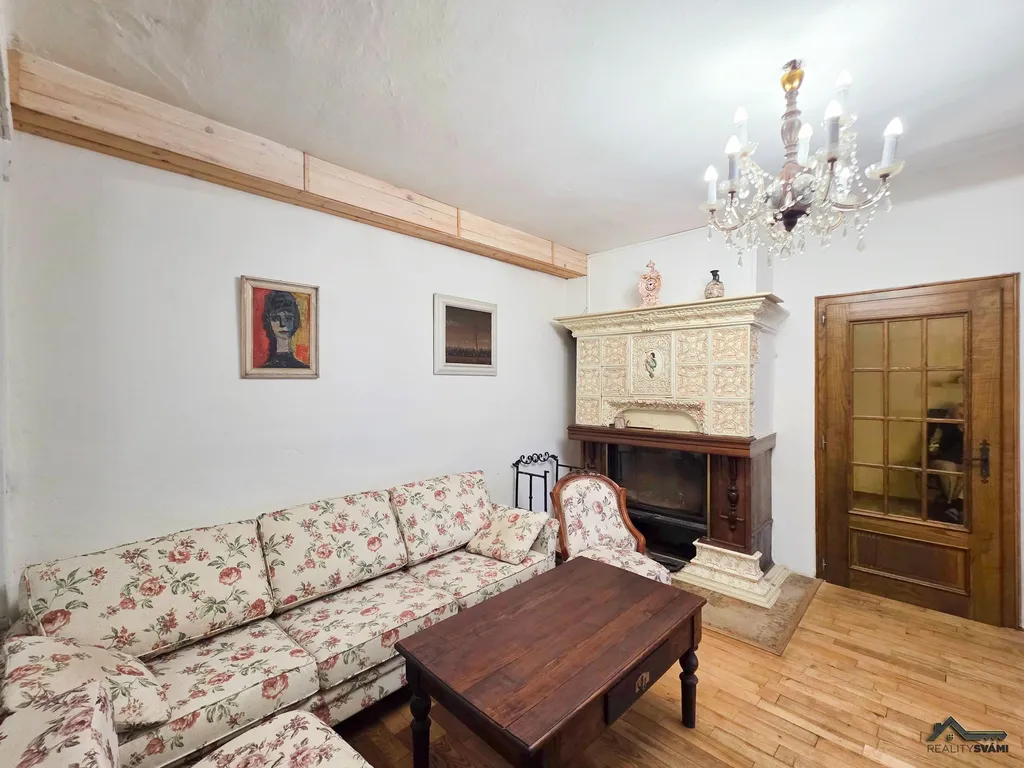 Přízemí kompletně rekonstruováno, obyvatelné a ve velmi dobrém stavu, dispozice: předsíň, společenská místnost s krbem průchozí ze dvou stran, z pravé strany přes ložnici, z levé strany propojená s obývacím pokojem a jídelnou, zde jsou dveře do garáže. Dále se přes obývací pokoj s jídelnou dostanete do prostorné