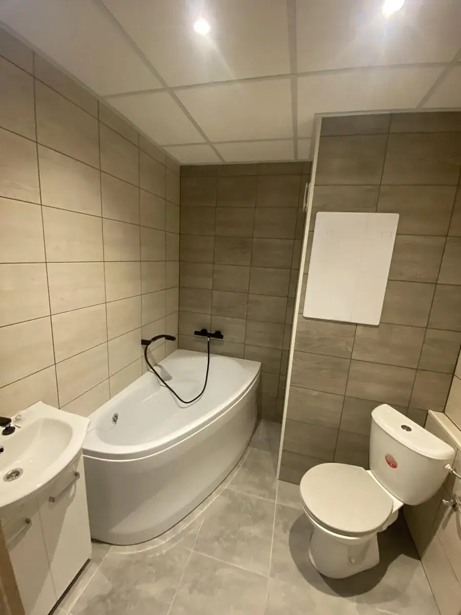 V kuchyni je kuchyňská linka s elektrickým sporákem a volně stojící lednice. Koupelna je obložena moderními obklady, je zde rohová vana, umyvadlová skříňka, pračka a WC. Celý interiér je laděn do krémových odstínů.