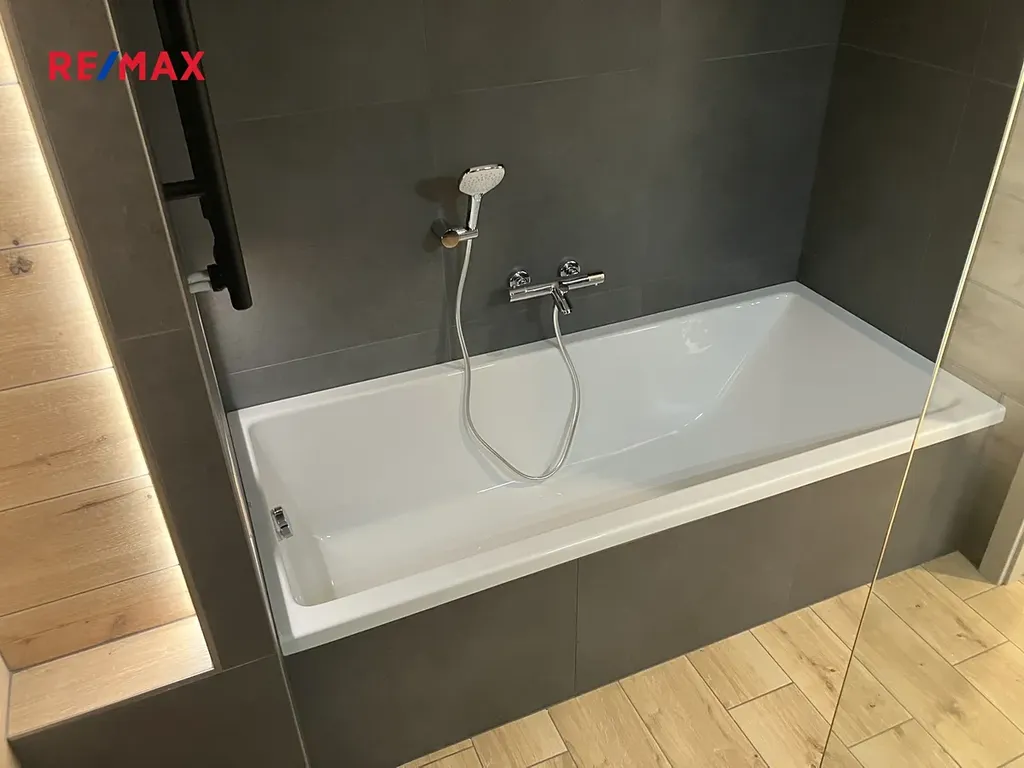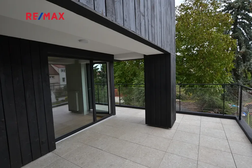 Byt čeká na svého prvního nájemce. Okna dvou pokojů a kuchyňského koutu jsou orientována na západní stranu, okna obývacího pokoje a ložnice s terasou na východní stranu do zahrady se vzrostlými stromy, kterou nájemce může využívat k relaxaci.